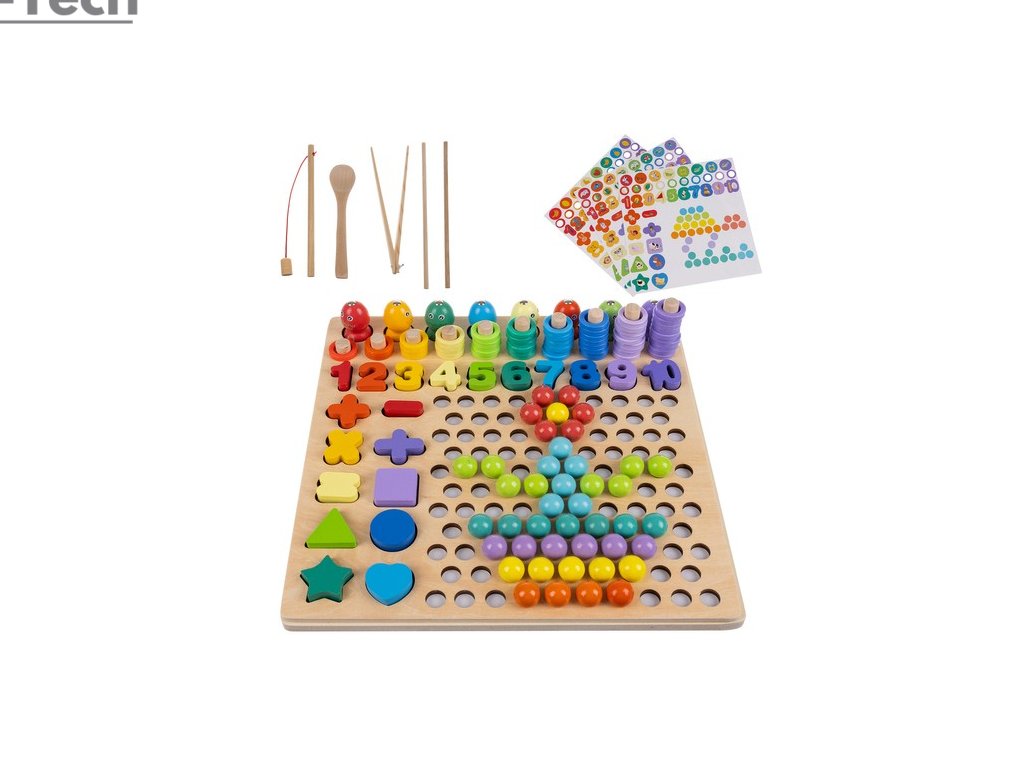 - Materiál: lipové drevo + guľôčky: drevo + PE kruhy + čísla, geometrické obrazce, matematické symboly MDF + ryba drevo + železo + PE formy + obojstranné dosky papier + palice drevo + kliešte drevo + lyžica drevo + rybársky prút drevo + PP + PS + magnet Rozvíja sústredenie a trpezlivosť