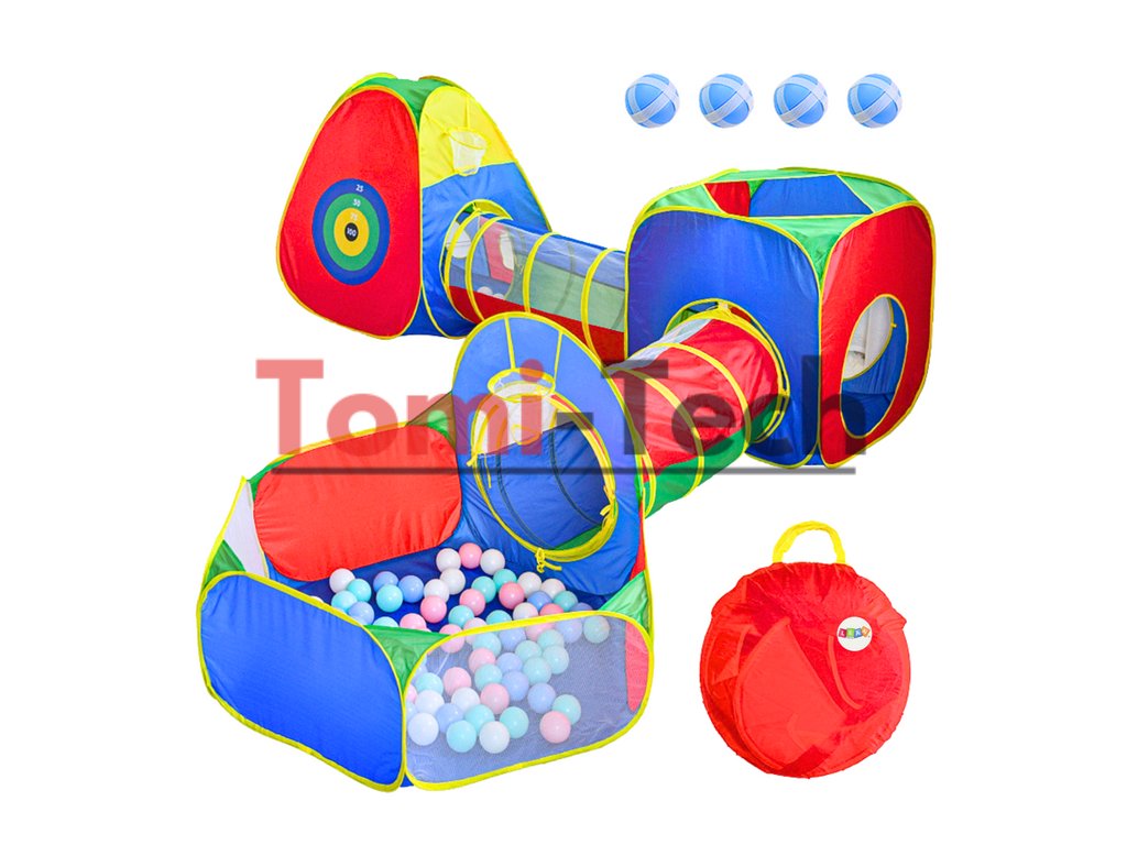 Veľké ihrisko, stan pre deti, tunely, bazén s loptičkami, Tracza Táto farebná sada stanov pre deti je plne mobilná a dá sa ľahko zostaviť a rozobrať bez akýchkoľvek obmedzení. Prvky sa po vybratí z puzdra rozložia takmer samy. Dajú sa ľubovoľne kombinovať a ak chcete, aby zostali nehybné, jednoducho ich zviažte priloženými stuhami. Táto sada je oveľa viac než len stany. Je to interaktívny priestor, ktorý povzbudzuje deti k kreativite. Deti si môžu vytvárať prístrešky, preliezať tunelmi, súťažiť v streľbe na terč alebo strieľať loptičky do obručí. Stany s tunelmi sú vybavené ďalšími funkciami pre ešte väčšiu zábavu. Trojuholníkový stan má terč na streľbu s loptičkami so suchým zipsom, ktorý je súčasťou sady. Štvorcový stan má dva vchody a spája stany tunelmi, čo deťom umožňuje voľne sa pohybovať z jedného stanu do druhého. Priestor na hádzanie loptičiek má košík na hádzanie.