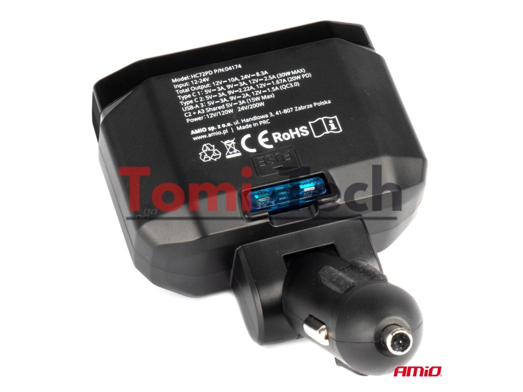 2*Zásuvka + PD30W + PD20W + QC3.0 Rozbočovač zásuviek do auta • Materiál:ABS+PC • Vstup: DC 12~24V • Celkový výstup: 12V/10A, 24V/8,3A • Typ C 1:5V3A,9V3A,12V2. 5A(30W MAX) • Typ C 2: 5V,3A/9V,2,22A/12,1,67A(20W PD) • USB-A 3:5V 3A, 9V 2A, 12V 1,5A (QC3.0) • C2 + A3 Shared 5V 3A (15W Max) • Výkon: 12V 120W 24V 200W