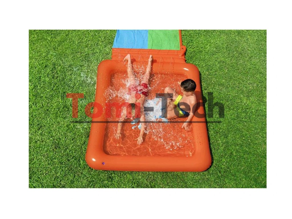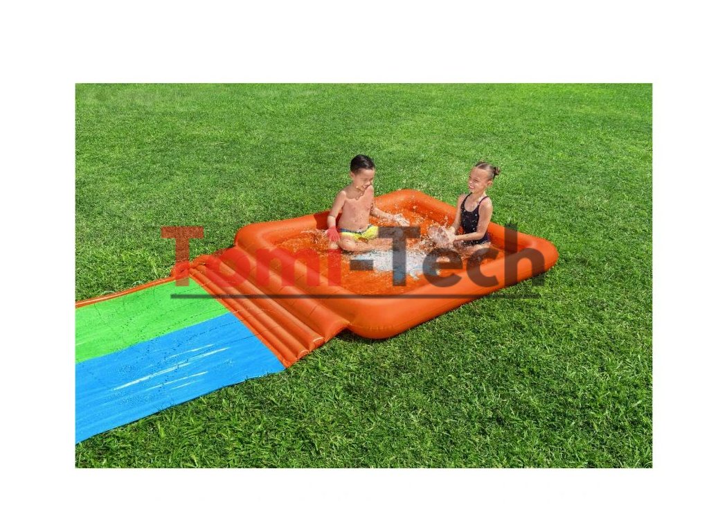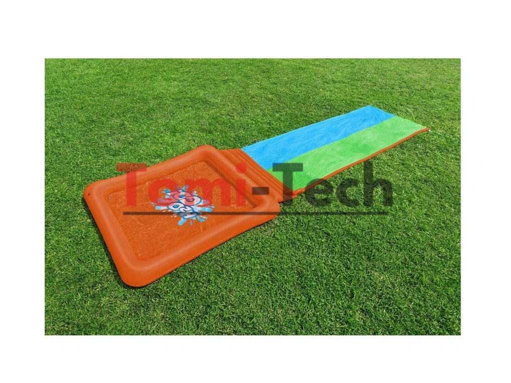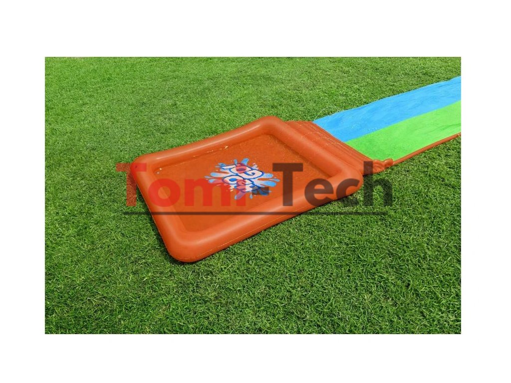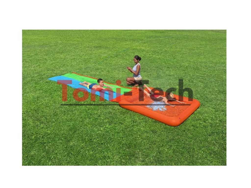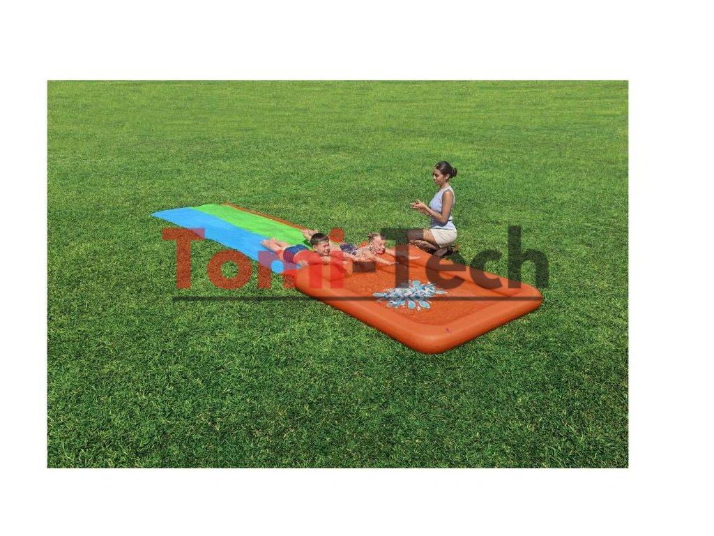 Vlastnosti produktu:Dĺžka šmýkačky: 5,31 metraZabudovaný bazénik: 129 litrov na konci šmýkačky pre extra zábavu.Jednoduché pripojenie: Nepotrebujete žiadne náradie, stačí pripojiť záhradnú hadicu a môžete začať!Dvojitá dráha: Perfektné pre súťaže a skupinové hry.Vodné sprchy: Vstavané rozprašovače zabezpečia kaskádový efekt a udržia povrch šmýkačky klzký.Zahŕňa: Opravná náplasť a farebné balenie.