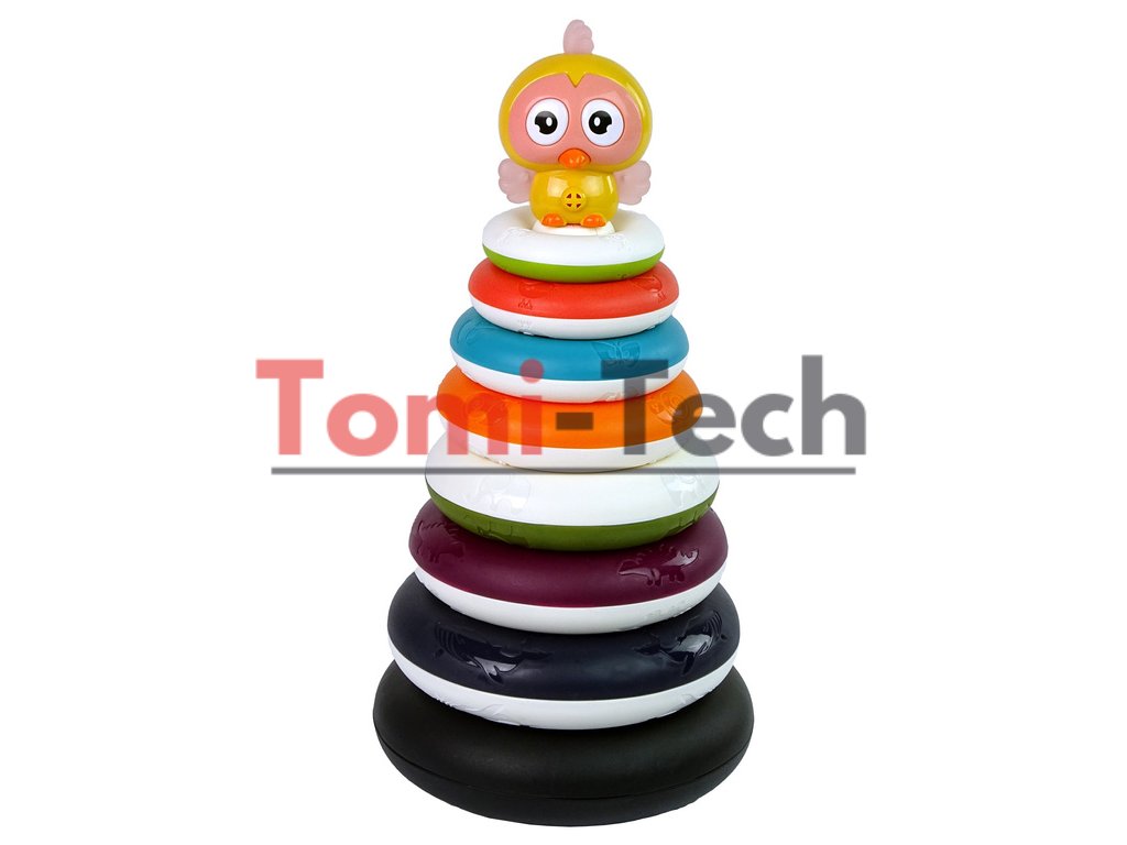 Pyramída z krúžkov je klasická hračka v rozprávkovo farebnom prevedení. Rozvíja motoriku a koncentráciu dieťaťa, pretože sa musí sústrediť na vytvorenie pyramídy. Vďaka tejto hračke sa dieťatko naučí rozoznávať veľkosť predmetov a farbu. Stohovanie krúžkov pomáha rozvíjať koordináciu ruka-oko a naučiť sa vyberať krúžky a usporiadať ich od najväčšieho po najmenší je skvelým úvodom do porovnávania veľkostí.