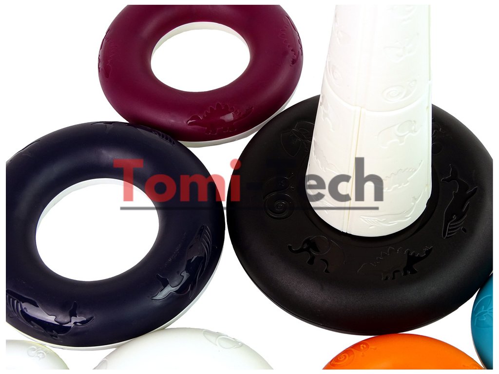 Súprava pozostáva z niekoľkých typov prsteňov rôznych veľkostí. Jednou z možností je vyskladať krúžky podľa fantázie dieťaťa. Žltá kačica umiestnená na vrchole pyramídy robí celú hru zaujímavejšou hrkaním. Jeho krídla sú vyrobené z mäkkej gumy, ktorá sa dá použiť ako hryzátko. Farebná farebná schéma zvieratiek pomôže vášmu dieťaťu rozvíjať sa a spoznávať svet okolo neho. Pyramída obsahuje aj obrázky zvierat zodpovedajúce príslušným kruhom. Vaše ratolesti môžu použiť obrázky ako návod pri stavbe veže.