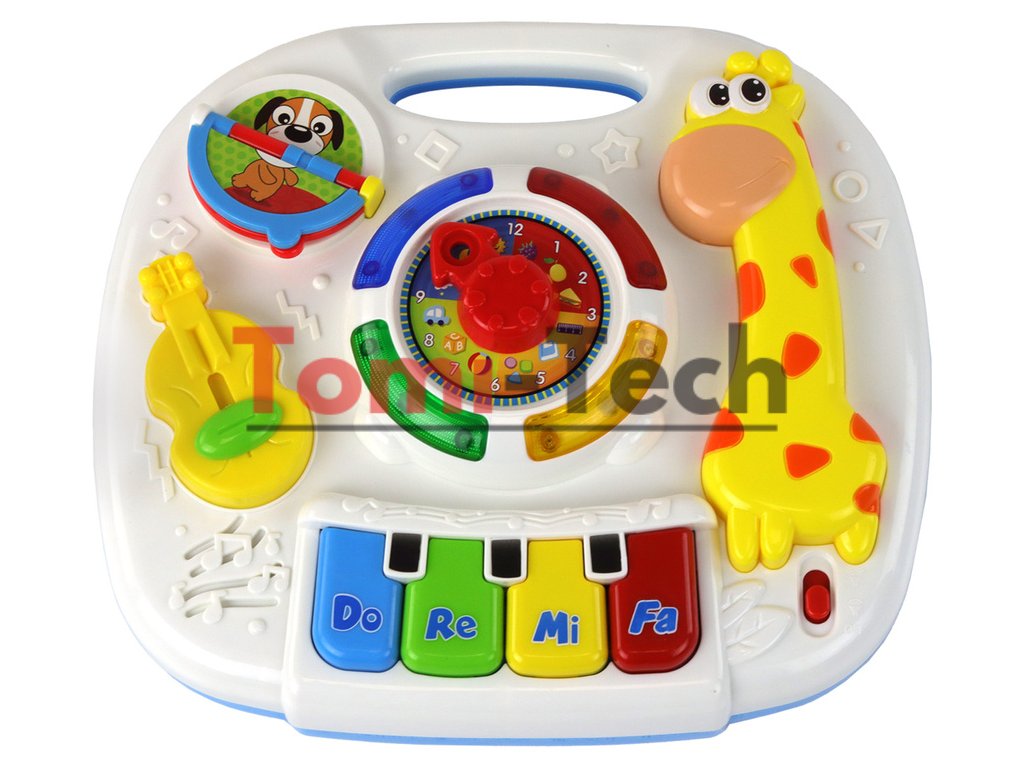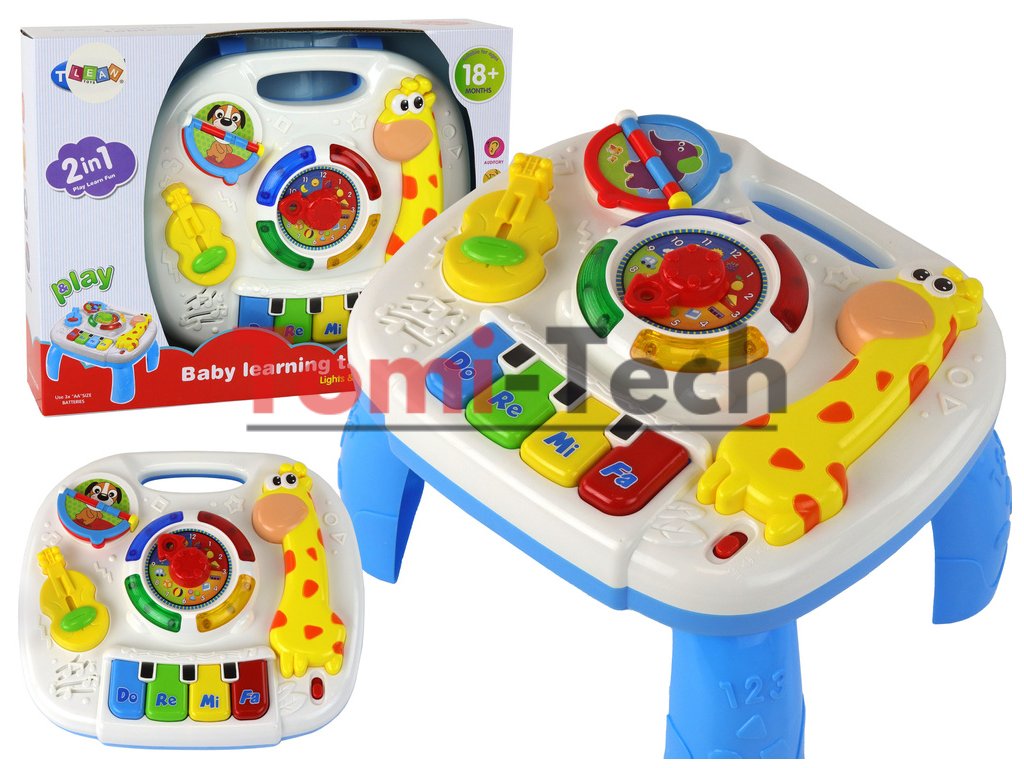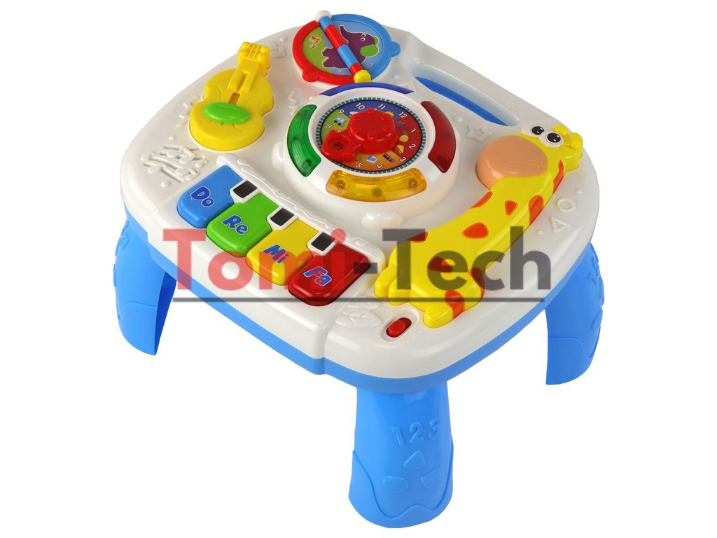 Vzdelávací stôl má aj mnoho ďalších prvkov, ktoré stimulujú zmysly a rozvíjajú kognitívne schopnosti. Malý klavír povzbudzuje skúmanie zvukov, žltá žirafa a gitara rozvíjajú záujem o hudobné nástroje a malá knižka s listovacími stránkami pomáha učiť sa o zvieratách.