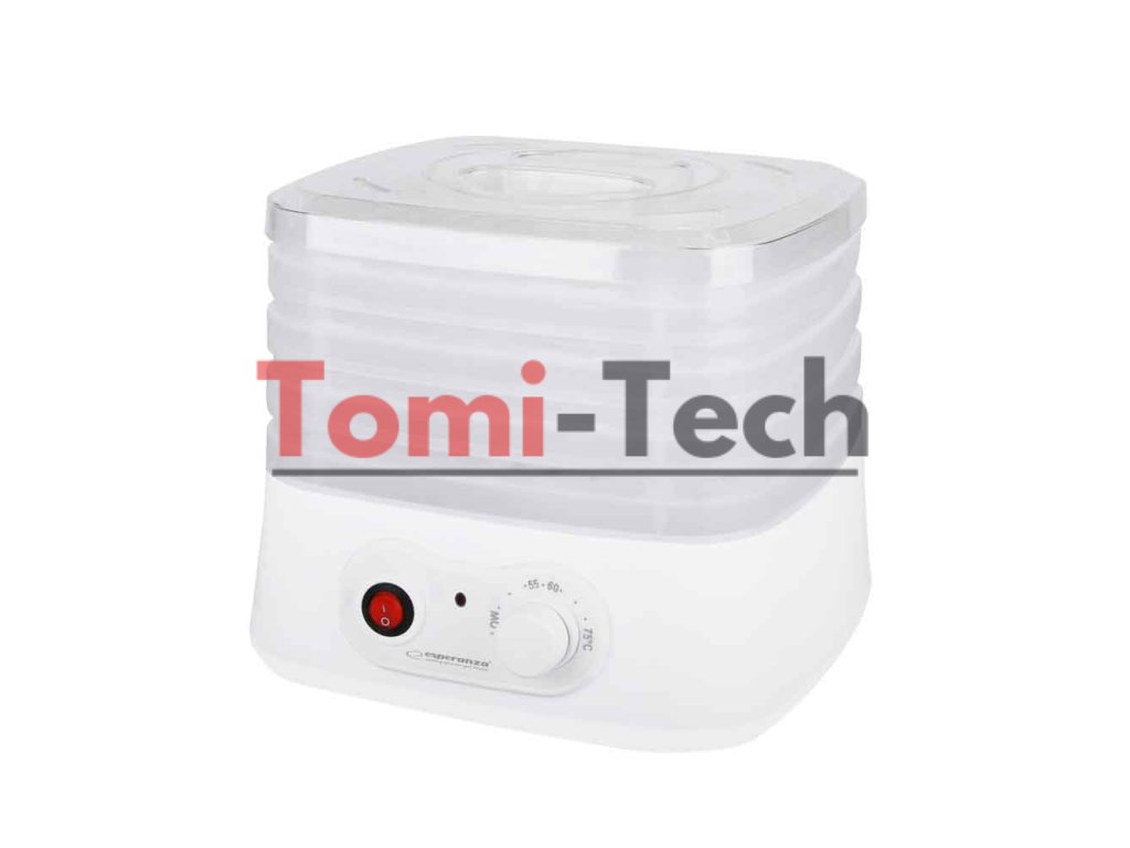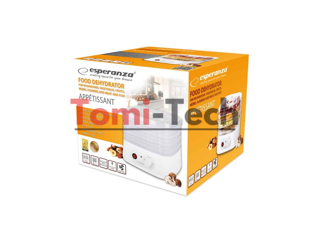 Sušička potravín Esperanza APPÉTISSANT je pokročilé zariadenie určené na efektívne a zdravé sušenie potravín. Vďaka výkonnému 250 W a vstavanému ventilátoru zariadenie zaisťuje rýchle, dôkladné a rovnomerné sušenie, čo umožňuje dlhodobé skladovanie ovocia, zeleniny, húb a ďalších surovín, pričom sa zachováva ich chuť, aróma a nutričná hodnota. Vďaka kompaktným rozmerom sa sušička perfektne hodí do každej kuchyne, aj do tých s obmedzeným priestorom, a ľahko sa skladuje. Esperanza APPÉTISSANT je nepostrádateľný spotrebič v každej modernej a zdravej kuchyni, ktorý vám umožní vychutnať si prirodzenú chuť produktov po celý rok bez pridania konzervačných látok a umelých látok.