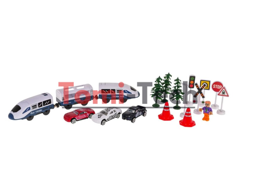 Obsah sady: dráha,most,zastávka,vlak,4 dopravné značky,3 stromy,semafor,stĺp verejného osvetlenia,3 autá,2 závory,figúrka