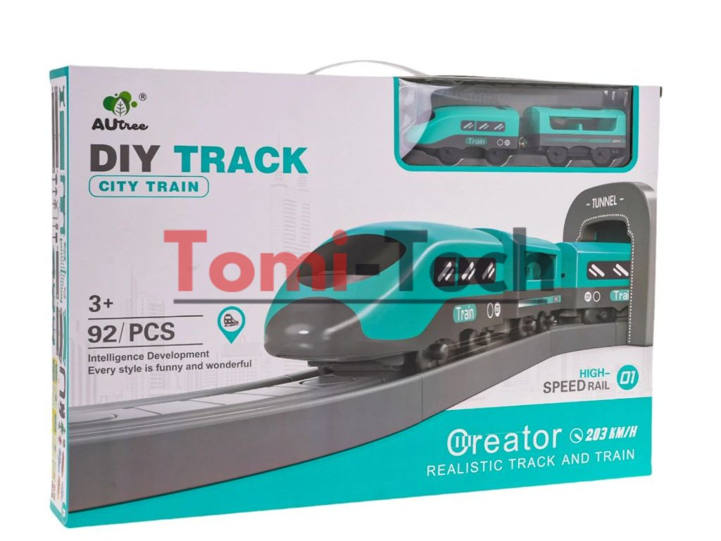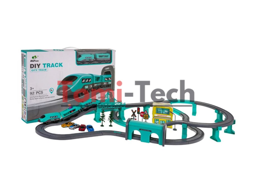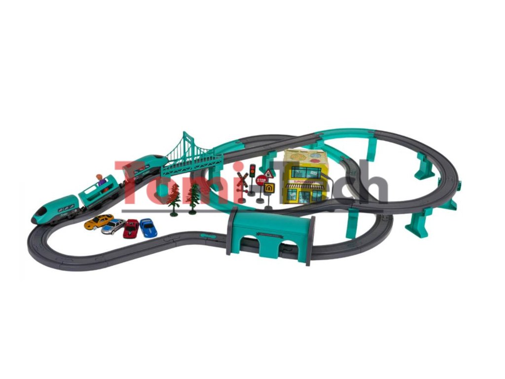Dobre vybavená koľajová súprava s vláčikom a príslušenstvom pre deti od 3 rokov . Sada je vyrobená z najkvalitnejšieho plastu v živých farbách priťahujúcich detské oči. Sada obsahuje 92 prvkov : stavebné diely koľají, vlak, stanica, most, supermarket, dopravné značky a tiež autíčka a figúrku. Vlak je napájaný 2 batériami AAA 1,5 V (nie sú súčasťou balenia)
