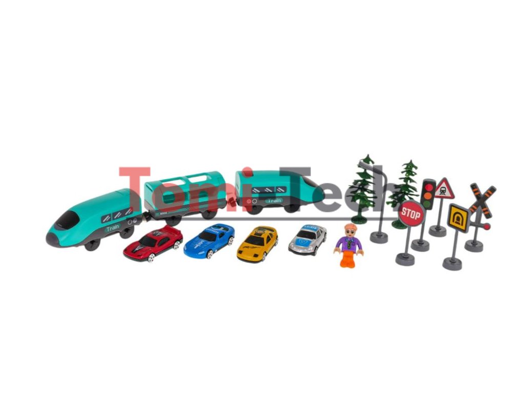 Obsah sady: dráha, most, tunel, supermarket (kartón),vlak, 5 dopravných značiek,2 stromy, 4 autá, figúrky, lampáš