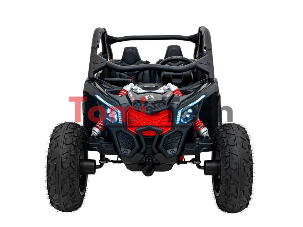 Buggy Maverick Turbo RR STRONG je terénne elektrické vozidlo určené pre dve deti, ktoré ponúka nielen množstvo zábavy, ale aj praktické funkcie, ako je zadný úložný priestor ideálny na hračky alebo drobnosti na cestu.Autíčko je vybavené dvoma výkonnými a tichými motormi s výkonom 320 W, teda celkovo 640 W. Napája ho dva akumulátory s kapacitou 24V 7-10Ah, ktoré zaisťujú dlhú dobu jazdy. Stav nabitia batérie je možné pohodlne sledovať na kontrolke v kokpite.Autíčko disponuje zvukovými a svetelnými efektmi . Štýlové LED osvetlenie vpredu aj vzadu zvyšuje viditeľnosť a dodáva vozidlu moderný vzhľad. Deti ocenia aj audio panel s FM rádiom, vstupmi na SD kartu, MP3, AUX a USB, a možnosťou pripojenia cez Bluetooth. K dispozícii sú aj predinštalované melódie a športové zvuky, ktoré sa aktivujú pri zošliapnutí plynového pedála.Pohodlie pri jazde zaisťujú veľké nafukovacie kolesá s ložiskami a zadnými tlmičmi. Vďaka nim autíčko bez problémov zvládne aj nerovný terén a jazda zostáva plynulá a komfortná.Bezpečnosť detí je prioritou . Vozítko je vybavené funkciou Pomalý štart , ktorá zabraňuje prudkému rozjazdu. Dve samostatné sedadlá potiahnuté eko kožou sú pohodlné a vybavené bezpečnostnými pásmi , ktoré zaisťujú bezpečnú jazdu bez ohľadu na terén.