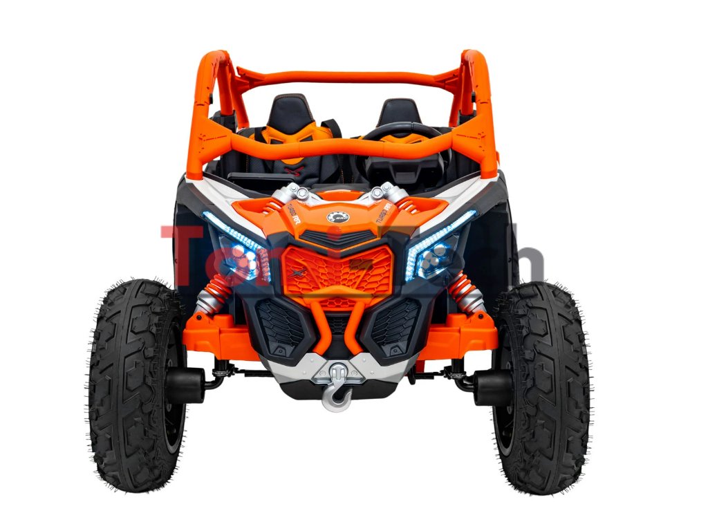 Buggy Maverick Turbo RR STRONG je terénne elektrické vozidlo určené pre dve deti, ktoré ponúka nielen množstvo zábavy, ale aj praktické funkcie, ako je zadný úložný priestor ideálny na hračky alebo drobnosti na cestu.Autíčko je vybavené dvoma výkonnými a tichými motormi s výkonom 320 W, teda celkovo 640 W. Napája ho dva akumulátory s kapacitou 24V 7-10Ah, ktoré zaisťujú dlhú dobu jazdy. Stav nabitia batérie je možné pohodlne sledovať na kontrolke v kokpite.Autíčko disponuje zvukovými a svetelnými efektmi . Štýlové LED osvetlenie vpredu aj vzadu zvyšuje viditeľnosť a dodáva vozidlu moderný vzhľad. Deti ocenia aj audio panel s FM rádiom, vstupmi na SD kartu, MP3, AUX a USB, a možnosťou pripojenia cez Bluetooth. K dispozícii sú aj predinštalované melódie a športové zvuky, ktoré sa aktivujú pri zošliapnutí plynového pedála.Pohodlie pri jazde zaisťujú veľké nafukovacie kolesá s ložiskami a zadnými tlmičmi. Vďaka nim autíčko bez problémov zvládne aj nerovný terén a jazda zostáva plynulá a komfortná.Bezpečnosť detí je prioritou . Vozítko je vybavené funkciou Pomalý štart , ktorá zabraňuje prudkému rozjazdu. Dve samostatné sedadlá potiahnuté eko kožou sú pohodlné a vybavené bezpečnostnými pásmi , ktoré zaisťujú bezpečnú jazdu bez ohľadu na terén.