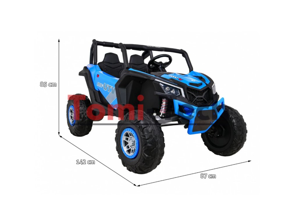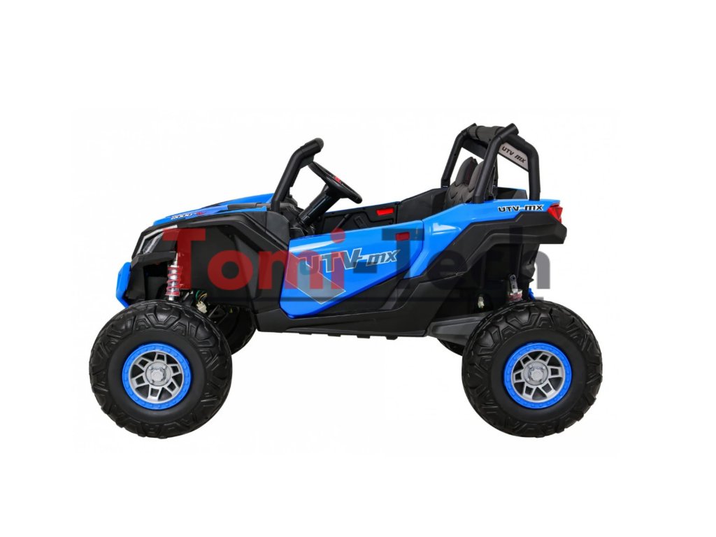 Detská elektrická Buggy UTV-MX so štyrmi výkonnými elektrickými motormi 60W a batériou 24V 7Ah. O pohodlnú jazdu sa postarajú veľké penové EVA kolesá , ktoré spoločne s motormi zdolajú terén či nespevnený typ povrchu.Jazdu určite spríjemní hudobný panel so vstupmi SD, MP3, AUX, USB a Bluetooth či predné aj zadné LED svetlá . Medzi ďalšie hudobné vybavenie patria tlačidlá so zvukmi a klaksónom na volante. Dieťa sa posadí do kvalitnej sedačky z ekologickej kože, takže sa pri výrobe myslelo aj na prírodu a bezpečnosť, pretože je vozidlo vybavené bezpečnostnými pásmi. Nosnosť vozidla je do 50 kg .Pomocou diaľkového ovládača je možné regulovať rýchlosť vozidla, meniť smer jazdy či použiť bezpečnostné tlačidlo Stop , ktoré ihneď zastaví vozidlo a vypne všetky jeho funkcie. Autíčko je možné regulovať ako z ovládača, tak pomocou plynového pedála. Vozítko je vybavenou funkciou automatickej brzdy, ktorá sa aktivuje po spustení nohy z plynového pedála.