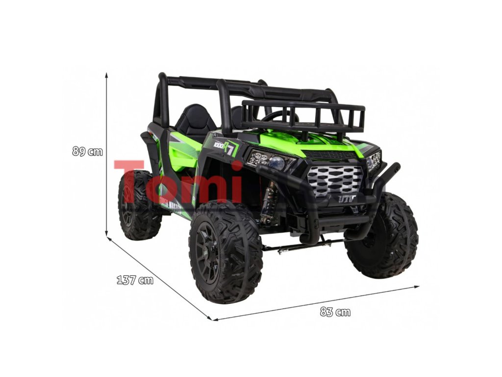 Detské elektrické auto Buggy UTV s dvoma výkonnými elektrickými motormi 200W. Autíčko hravo zvládne akýkoľvek terén. Do sedačky z mäkkej ekologickej kože sa pohodlne posadí aj dve deti, pretože sa Buggy pýši nosnosťou až do 50 kg.