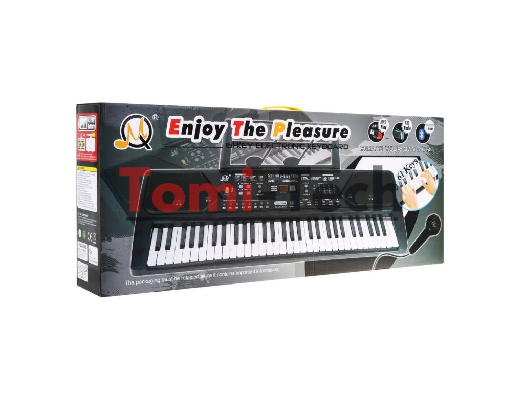 Detský veľký keyboard: 61 kláves, 36 bielych klávesov, 25 čiernych kláves, Regulácia hlasitosti,Zvuky bicích nástrojov,10 rytmov, Tlačidlo Stop,16 tónov, Nahrávanie – Record Funkcia akordov, 6 demo nahraných skladieb,MP3,Rádio, Bluetooth,Reproduktory,