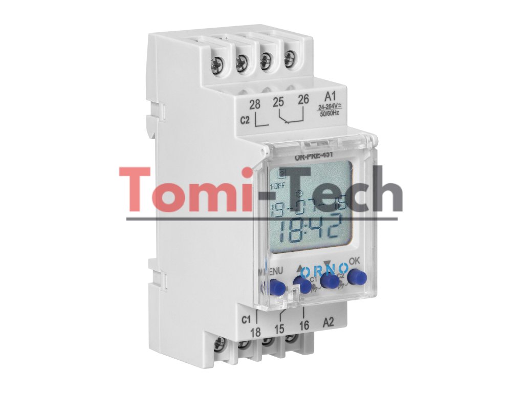 Elektronický astronomický a časový programátor, 100 programov, 3 jazyky menu, 2 reléové výstupy max. 16A/230V, šírka 2 moduly, DIN TH-35mm