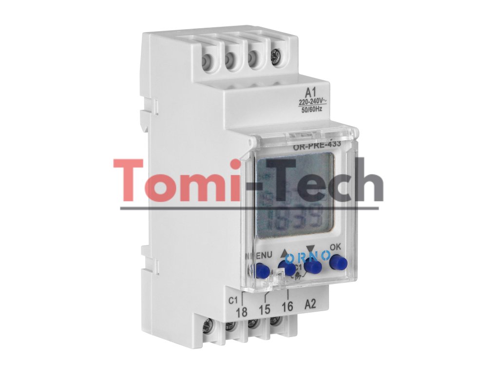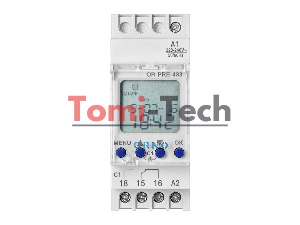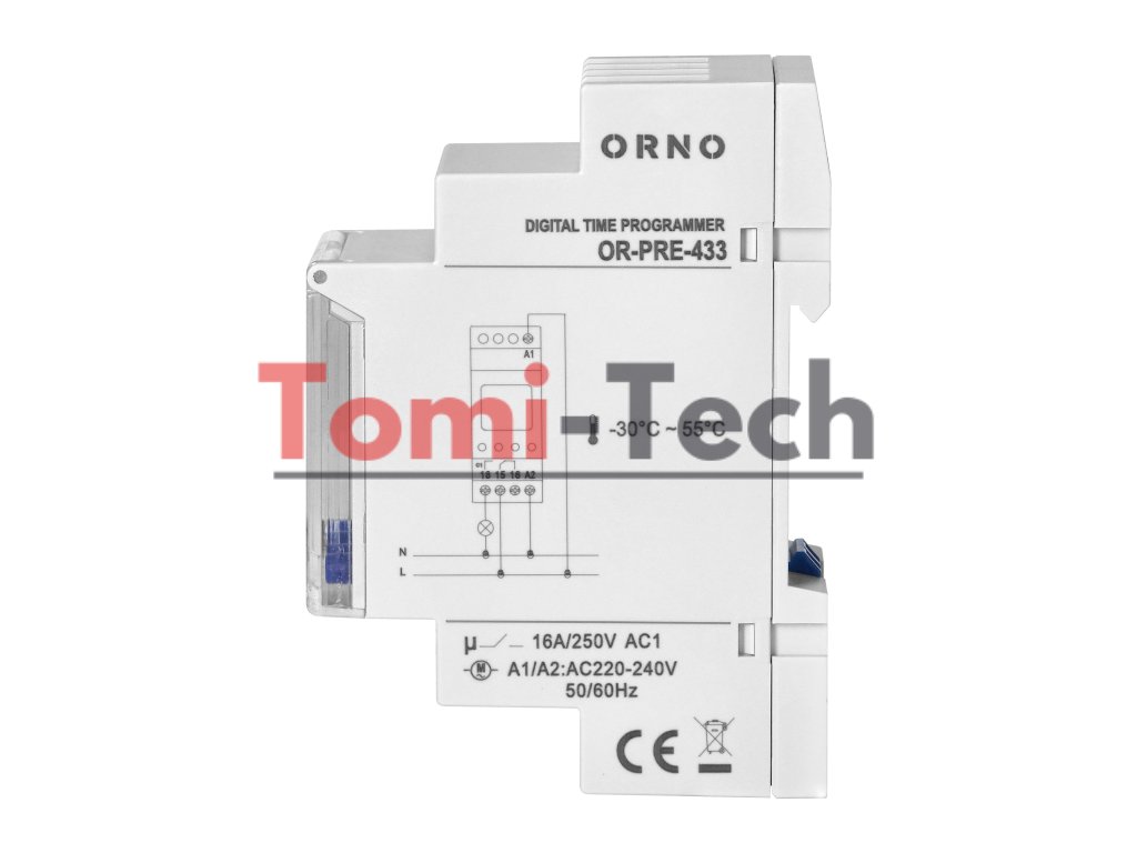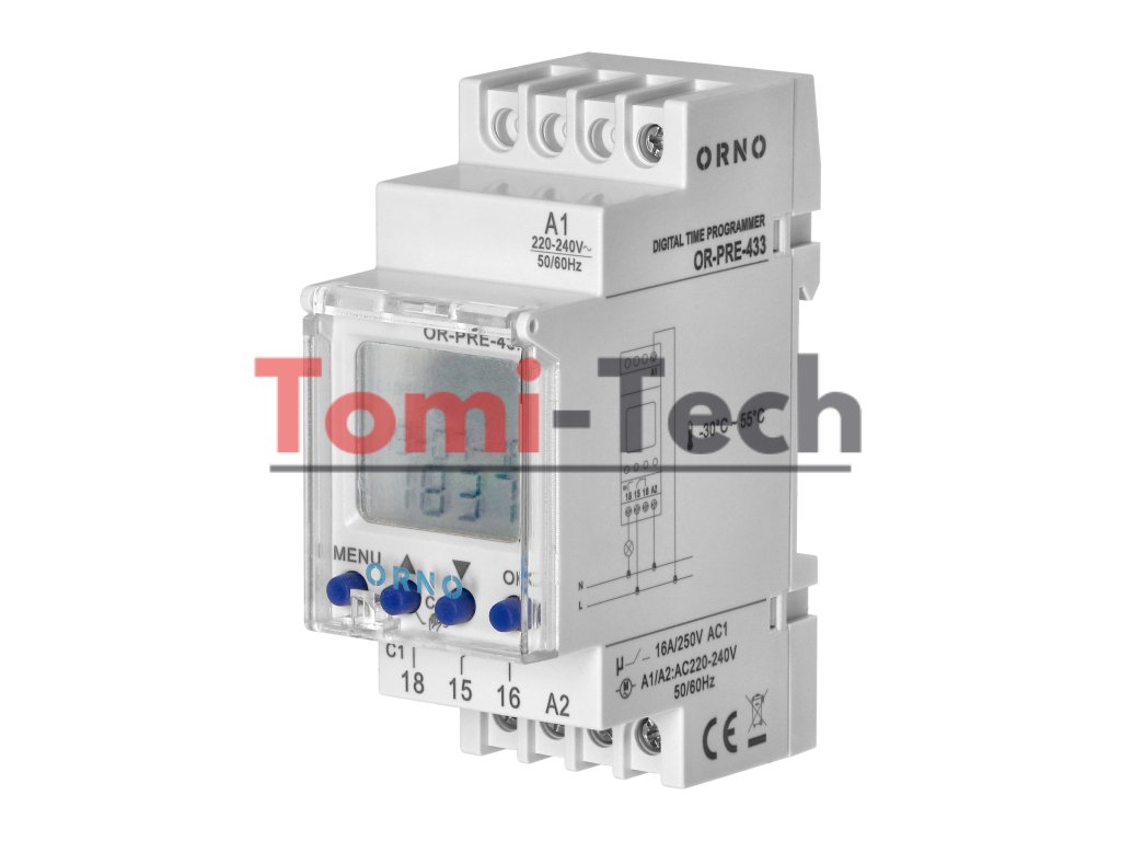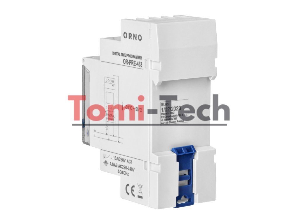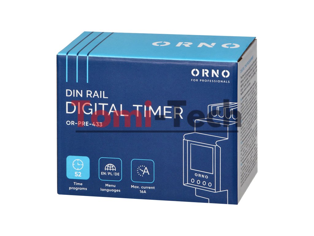 Elektronický časovač s LCD displejom, určený na montáž na štandardnú DIN lištu TH-35 mm. Slúži na nastavenie časov zapnutia a vypnutia elektrických zariadení, ako sú ohrievače vody, osvetlenie, motory, čerpadlá atď. Funkcie zahŕňajú: 52 časových programov, týždenné a pulzné cykly nastavenia, manuálny, automatický alebo prázdninový prevádzkový režim, 3-ročnú záložnú energiu (lítiová batéria), letný čas a 3 jazyky ponuky: poľština, nemčina a angličtina.Dodatočné parametre