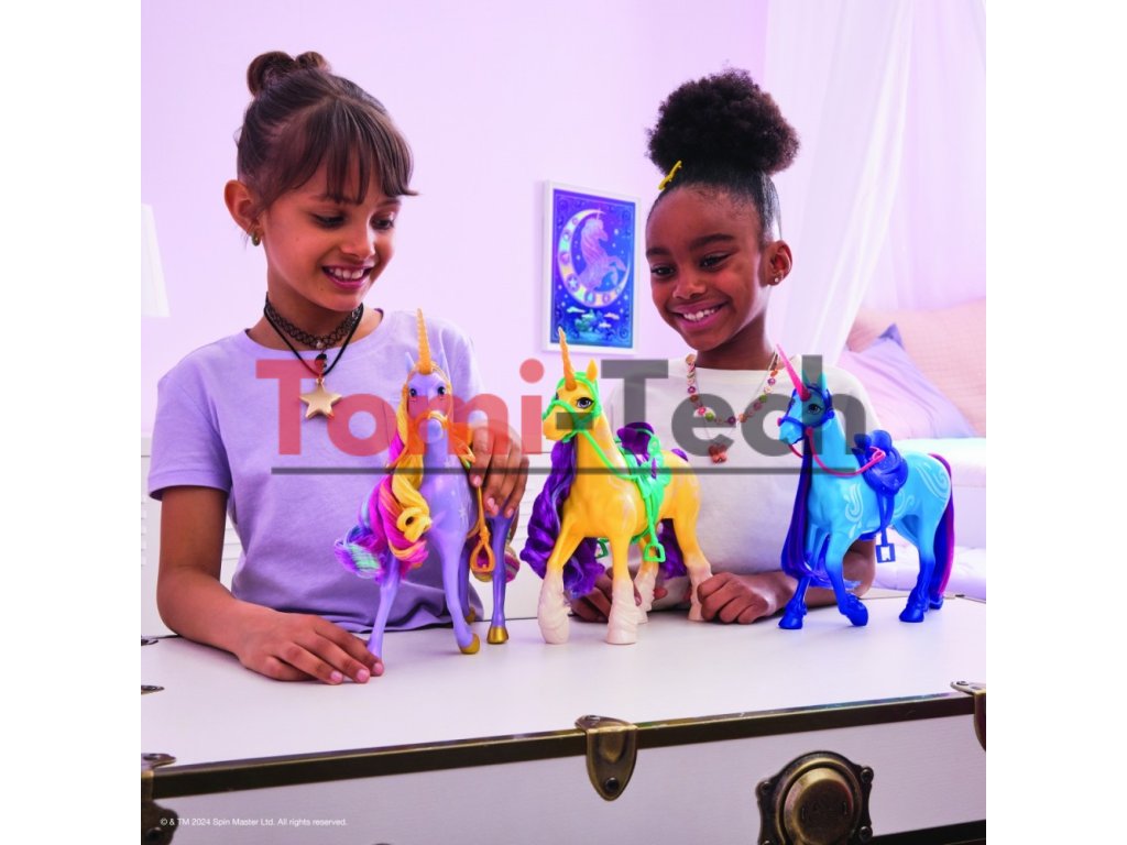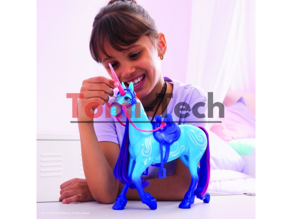 Doplňte svoju zbierku bábik Unicorn Academy o Wireka, Isabeliného jednorožca! Táto 27 cm veľká hračka jednorožca Wireka, inšpirovaná animovaným seriálom NETFLIX a obľúbenou detskou sériou kníh o priateľstve, pomáha vdýchnuť život tomuto jemnému a plachému stvoreniu. Starostlivo vyrobená bábika jednorožca Wireka má na boku perleťové znaky vodnej mágie, majestátny trblietavý roh, farebnú hrivu a chvost a odnímateľnú uzdu a sedlo pre bábiku pre ešte väčšiu hravosť. Jemne pohybujte Wirekovou hlavou, aby ste zvýraznili jeho osobnosť a znovu prežili magické puto medzi jednorožcom a Isabel, ktorá na ňom jazdí. Prečešte Wirekovu mäkkú hrivu a chvost Isabeliným nástrojom na úpravu vlasov (nie je súčasťou balenia, predáva sa samostatne s bábikou) a vydajte sa na dobrodružstvo, aby ste ochránili Ostrov jednorožcov a jeho mágiu! Pre ďalšie spôsoby, ako zažiť Unicorn Academy a svoje obľúbené postavy, hľadajte bábiky Avu a Sophiu a ich jednorožcov a interaktívne bábiky Hviezdu a List (každý sa predáva samostatne), ktoré rozšíria svet kníh a televíznych seriálov! Magické putá medzi študentmi Unicorn Academy a ich zvieratami podnietia fantáziu k nekonečnému množstvu príbehov. Hračky Unicorn Academy sú skvelými darčekmi na sviatky alebo špeciálne príležitosti pre deti, ktoré milujú hračkárske jednorožce a kone, bábiky a doplnky, domčeky pre bábiky, zberateľské predmety, plyšové zvieratká a ďalšie. Prineste si domov kúzlo Unicorn Academy s Whirlwindom!