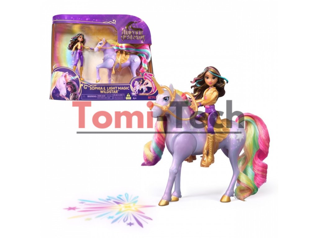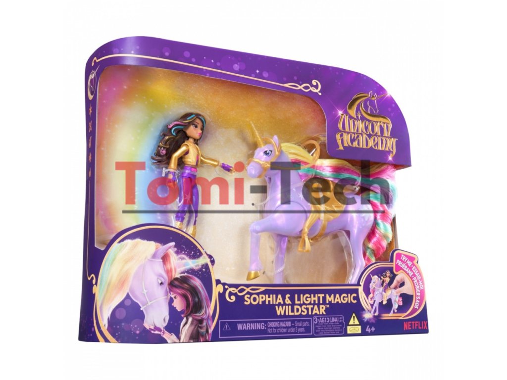 Zažite kúzlo Unicorn Academy so Sophiou a Star Light Magic! Inšpirované animovaným seriálom NETFLIX a najpredávanejšou sériou kníh o priateľstve, toto duo oslavuje špeciálne puto medzi jazdcom a jednorožcom. S verne reprodukovanými detailmi, mäkkou dúhovou hrivou a chvostom a skutočnými svetelnými efektmi Star táto sada prebudí kúzlo fantázie. Vďaka 7 bodom artikulácie môžete Sophiu umiestniť do pozície, aby jazdila na Star, a stlačením tlačidla hviezdy na boku jednorožca aktivovať svetlá (súčasťou balenia sú 3 batérie LR44) a znovu vytvoriť obľúbené scény. Star dupe kopytom a pomocou svojej svetelnej mágie premieta dúhový vzor, rovnako ako v seriáli! Sophia bezpečne zostáva na Starlight vďaka odnímateľnej uzde a sedlu. Ak chcete preskúmať Unicorn Academy s vašimi obľúbenými postavami, pozrite si ďalšie malé bábiky vrátane Avy, Layly, Isabel, Valentiny a ich jednorožcov (sady sa predávajú samostatne), aby ste rozšírili svet kníh a televíznych seriálov! Hračky z Unicorn Academy sú skvelými darčekmi na sviatky alebo špeciálne príležitosti pre deti, ktoré milujú jednorožcov a kone, bábiky a doplnky, domčeky pre bábiky, zberateľské predmety, plyšové hračky a mnoho ďalšieho. Zažiarte vo svojich dobrodružstvách v Unicorn Academy so Sofiou a kúzlom hviezdneho svetla!