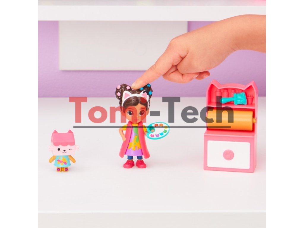 Namaľujte majstrovské dielo so sadou Gabi a Gabiin mačací domček: Umelecké štúdio! Táto zábavná hračkárska sada obsahuje 9,6 cm zberateľskú figúrku Gabi, figúrku kartónového mláďaťa, umeleckú skrinku, paletu na farby a prepravnú krabicu s domčekom pre bábiky s prekvapivým doplnkom vo vnútri! Rovnako ako Gabi na začiatku každej epizódy, rozbaľte si svoj špeciálny balíček Mačacieho domčeka a objavte tajomný doplnok. Čo nájdete vo vnútri? Keď niečo objavíte, použite svoju fantáziu a zahrajte si vlastné dobrodružstvá s Gabi a kartónovým mláďaťom! Vložte paletu alebo prekvapivý doplnok do Gabinej ruky a pomôžte jej kreatívne sa rozvíjať v štúdiu. Stlačte Gabiine mačacie uši a sledujte, ako sa jej zástera premení z čistej na postriekanú farbou! Znovu stlačte mačacie uši, aby ste zásteru vyčistili. Je to taká zábava! Potom predstierajte, že vyťahujete papier z rolky – naozaj sa točí! Táto detská hračka je perfektným darčekom a možno ju použiť s Gabiiným domčekom pre bábiky Purrfect (predáva sa samostatne). Objavte ďalšie možnosti rozprávania príbehov so všetkými hracími súpravami Gabby's Cathouse vrátane Kvetinovej záhrady a Mačiatka Karaoke (každá sa predáva samostatne)! Ako posledné prekvapenie naskenujte QR kód vo vnútri súpravy Cathouse a odomknite si špeciálnu odmenu v bezplatnej aplikácii Gabby's Dollhouse (k dispozícii pre iOS a Android). Prineste si domov súpravu Art Studio a pridajte sa ku Gabby z Cathouse pri maľovaní!