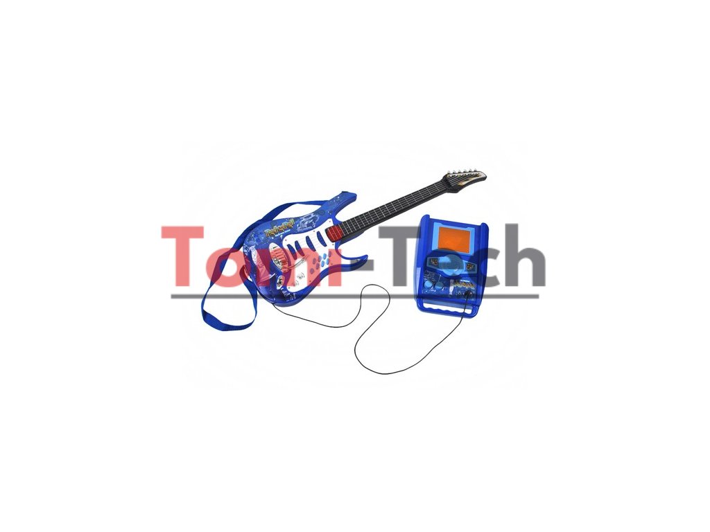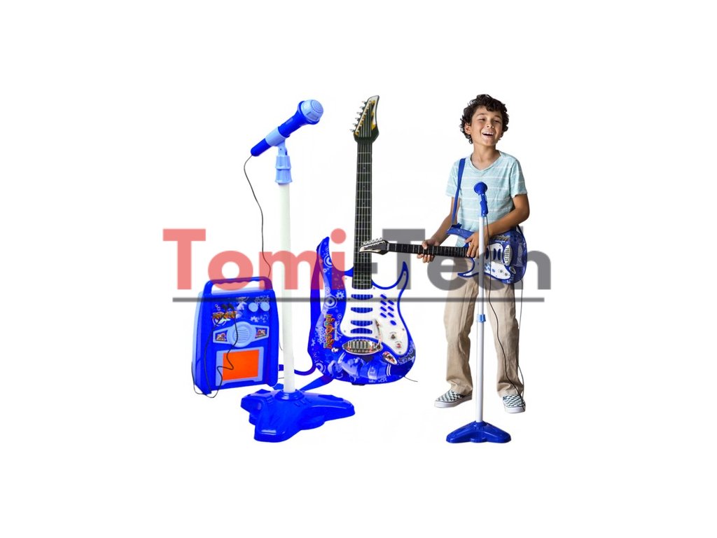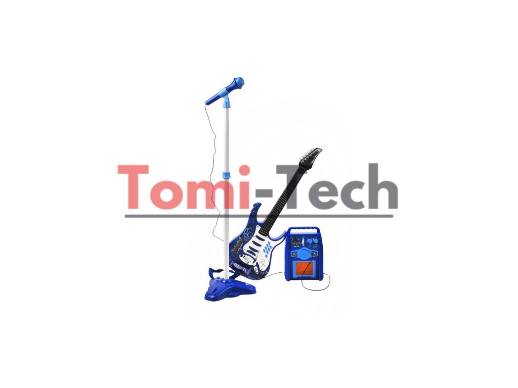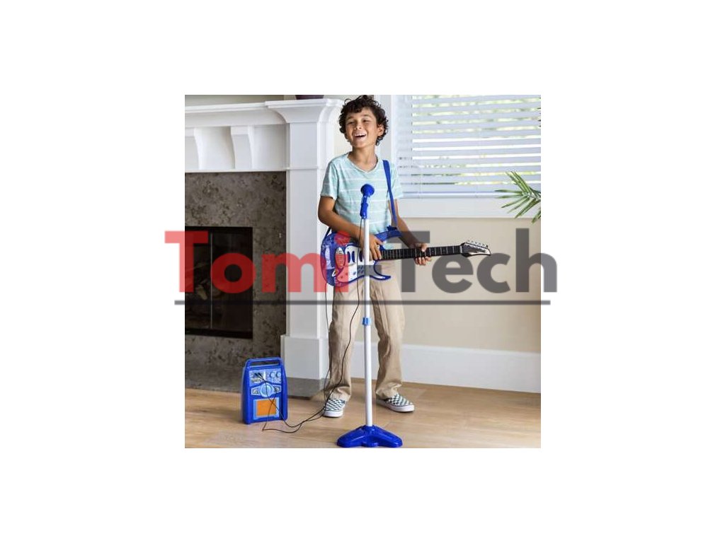 - ŠPECIFIKÁCIE - farba: modrá; napájanie gitary: 3 x AA batérie (nie sú súčasťou balenia); napájanie zosilňovača: 3 x AA batérie (nie sú súčasťou balenia); dĺžka popruhu: 90 cm; rozmery napájacieho zdroja: 27 x 19 cm; výška mikrofónu: 63 - 100 cm; rozmery gitary: 72 x 24 cm; hmotnosť: 1,55 kg; Hmotnosť v balení: 1,8 kg.