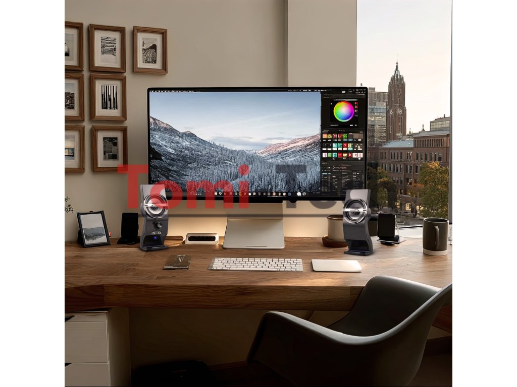 Ich moderný dizajn z nich robí perfektný doplnok k LCD monitorom a ďalšiemu príslušenstvu na stole. Fungujú so všetkými počítačmi s výstupom na reproduktor a portom USB. Majú elegantný a moderný kryt odolný voči poškriabaniu.