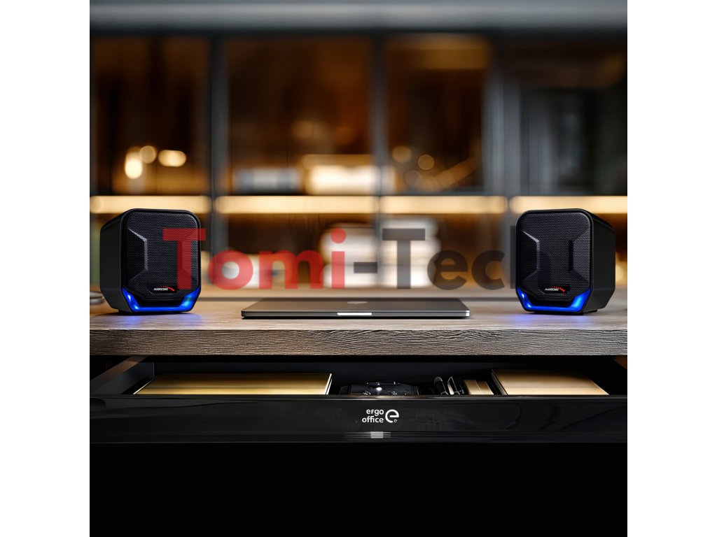 Ich moderný dizajn z nich robí perfektný doplnok k LED a LCD monitorom a ďalšiemu príslušenstvu na stole. Modré LED podsvietenie dodáva reproduktorom charakter.