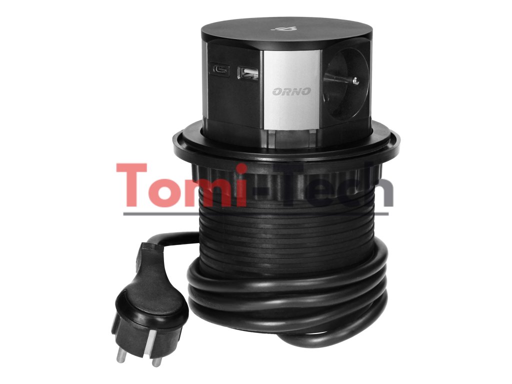 Nábytková zásuvka Ø10cm výsuvná zo stola s indukčnou nabíjačkou, USB nabíjačkou a 1,5m káblom, 3x2P+Z, Qi 1.2.4 max. 10W, USB A+C QC 3.0