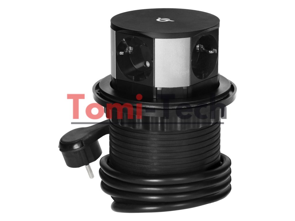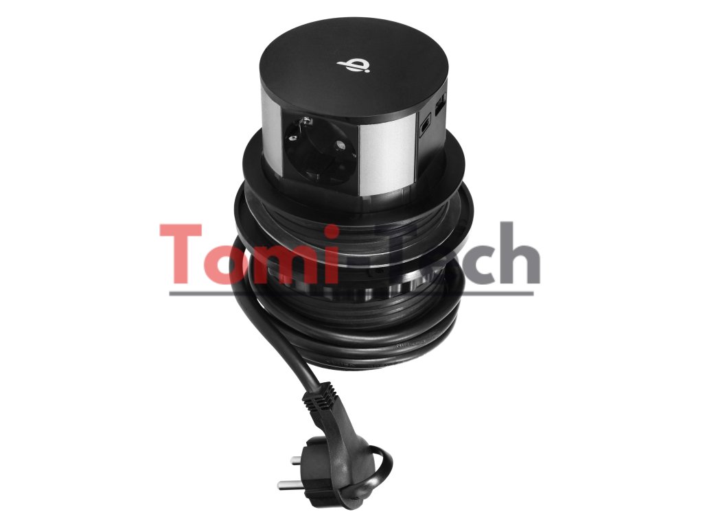 Nábytková zásuvka Ø10cm výsuvná zo stola s indukčnou nabíjačkou, USB nabíjačkou a 1,5m káblom, 3x2P+Z (Schuko), Qi 1.2.4 max. 10W, USB A+C QC 3.0