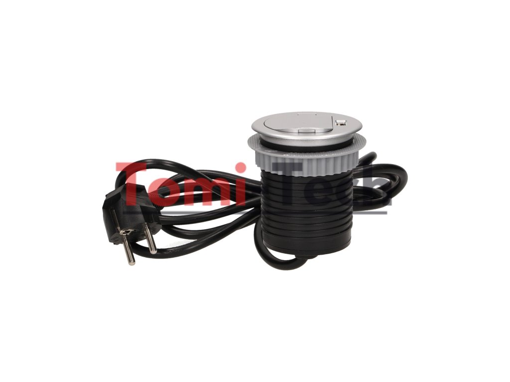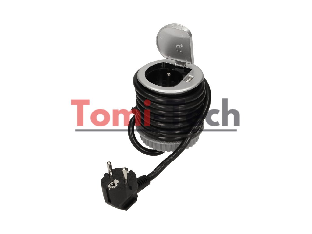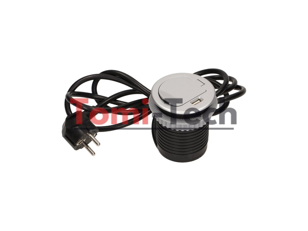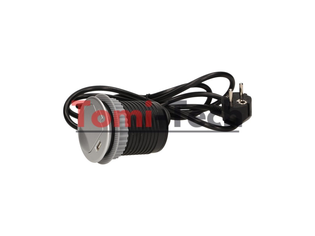 Nábytková zásuvka Ø6cm zapustená do kuchynskej linky s krytom, USB nabíjačkou a 1,8m káblom, 1x2P+Z, 1xUSB