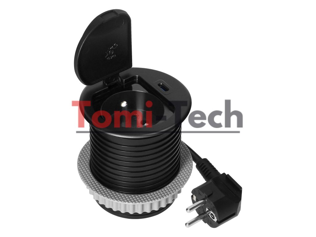 Nábytková zásuvka Ø6 cm, zapustená do pracovnej dosky, s krytom, USB nabíjačkou a 1,9 m káblom, 1x2P+Z (francúzska), 1xUSB (typ C; 20 W), čierna