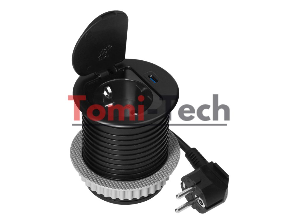 Nábytková zásuvka Ø6 cm, zapustená do kuchynskej linky, s krytom, USB nabíjačkou a 1,9 m káblom, 1x2P+Z (Schuko), 1xUSB (typ C; 20W), čierna