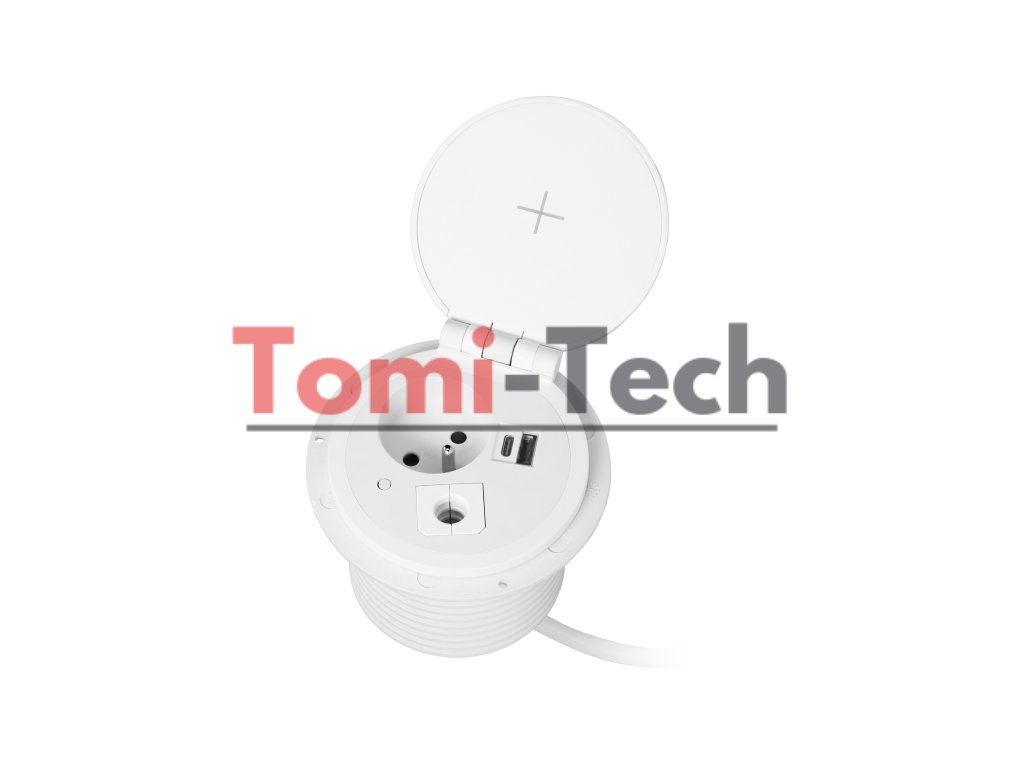 Kompaktná, zapustená nábytková zásuvka vhodná na akýkoľvek stôl. Obsahuje jednu elektrickú zásuvku 1x2P+Z, indukčnú nabíjačku, rýchlu USB nabíjačku s dvoma zásuvkami A a C a ďalší odnímateľný modul, ktorý sa dá jednoducho vymeniť za iný funkčný modul (voliteľné príslušenstvo), čo vám umožní pripojiť rôzne zariadenia na jednom mieste. Je vybavená 1,8 m káblom a je bielej farby.Dodatočné parametre