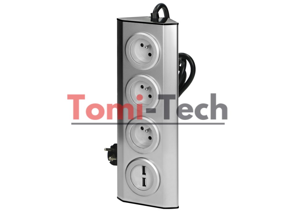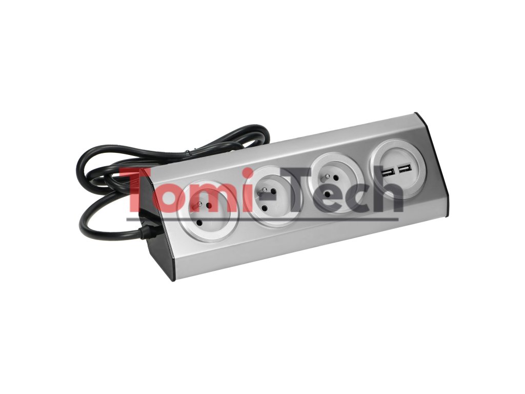 Nábytok, kuchynská zásuvka s USB nabíjačkou, upevnenie na suchý zips s 1,5m káblom - 3x2P+Z, 2xUSB, INOX s 1,5m káblom.