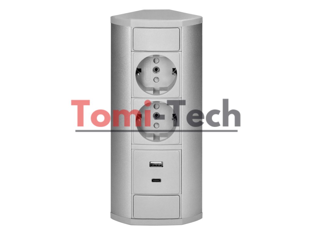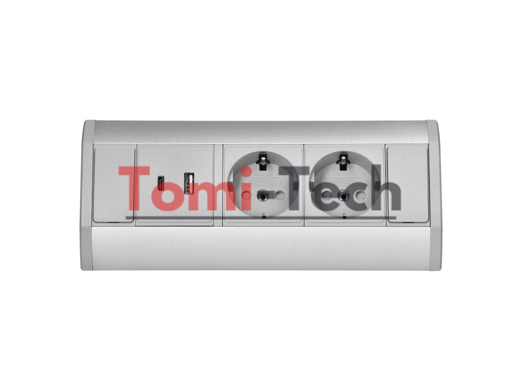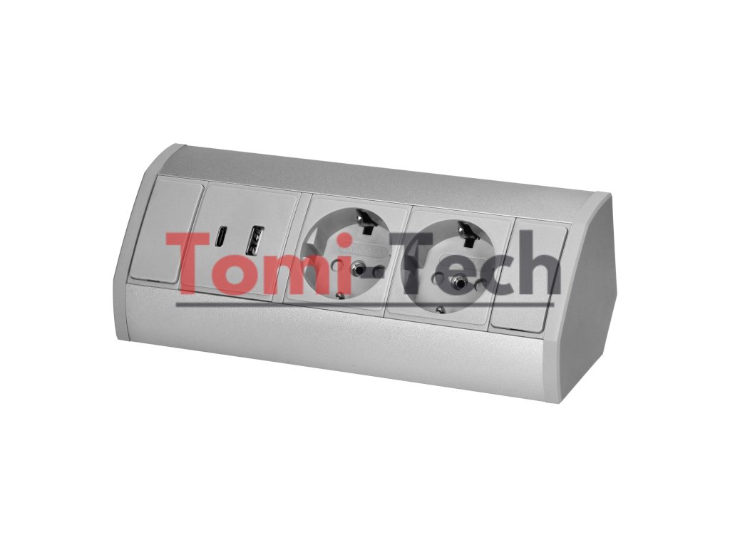 Nábytková zásuvka 2x2P+Z (Schuko), 2xUSB (typ A+C; 2,4A), sivo-strieborná