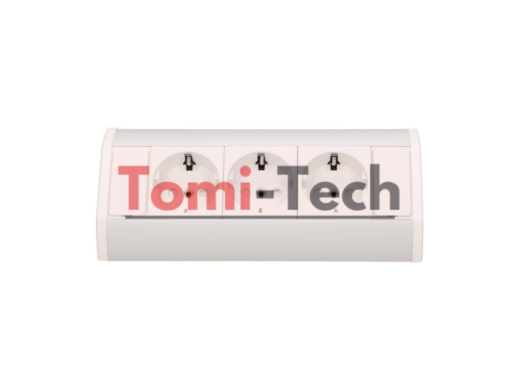 Sada troch sieťových zásuviek s uzemnením a ochranou proti preťaženiu, ideálna na inštaláciu do skriniek, vitrín a výkladných skriniek.Dodatočné parametre