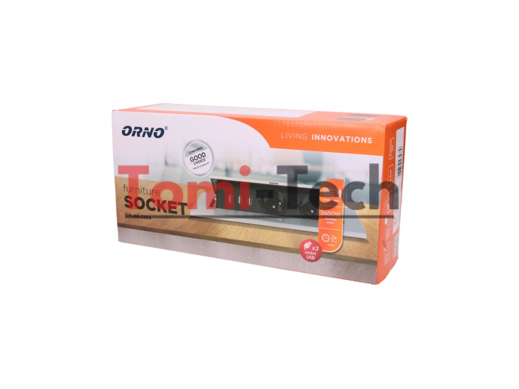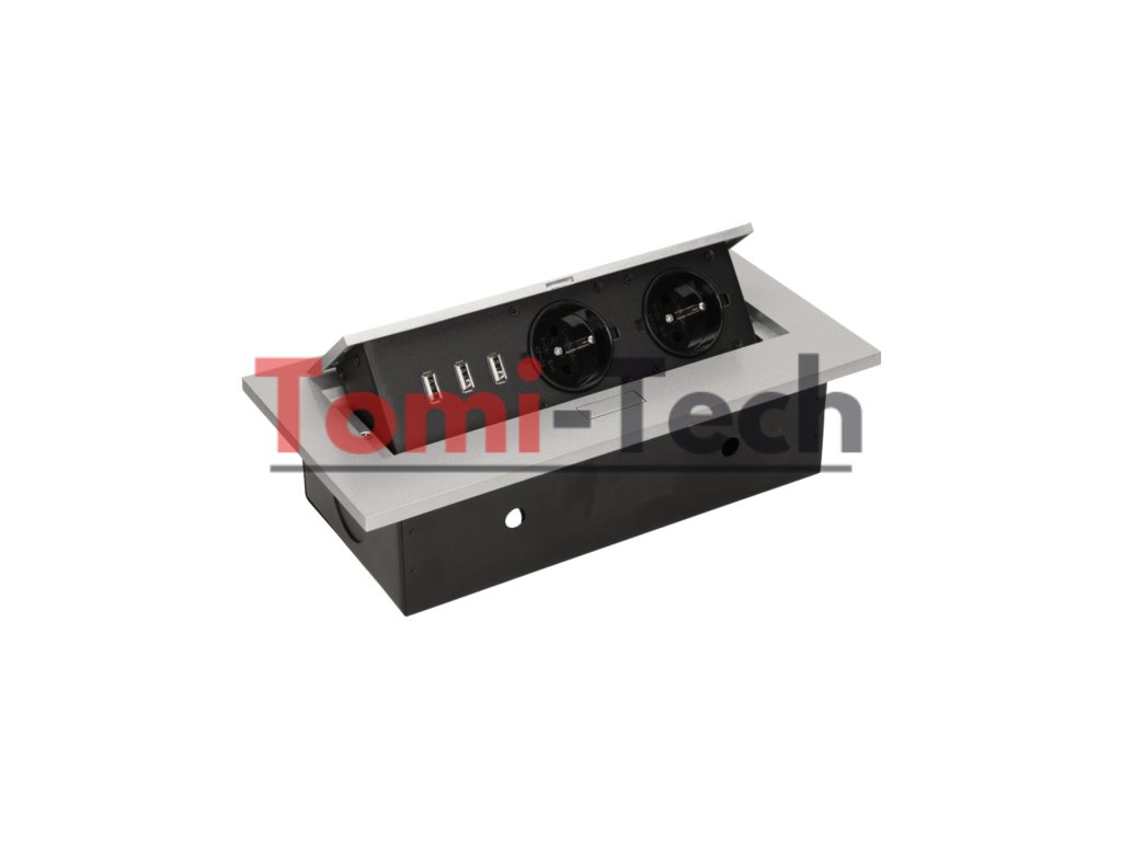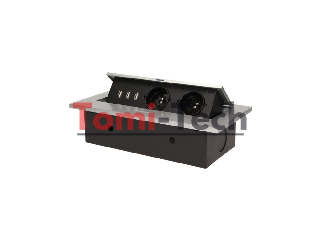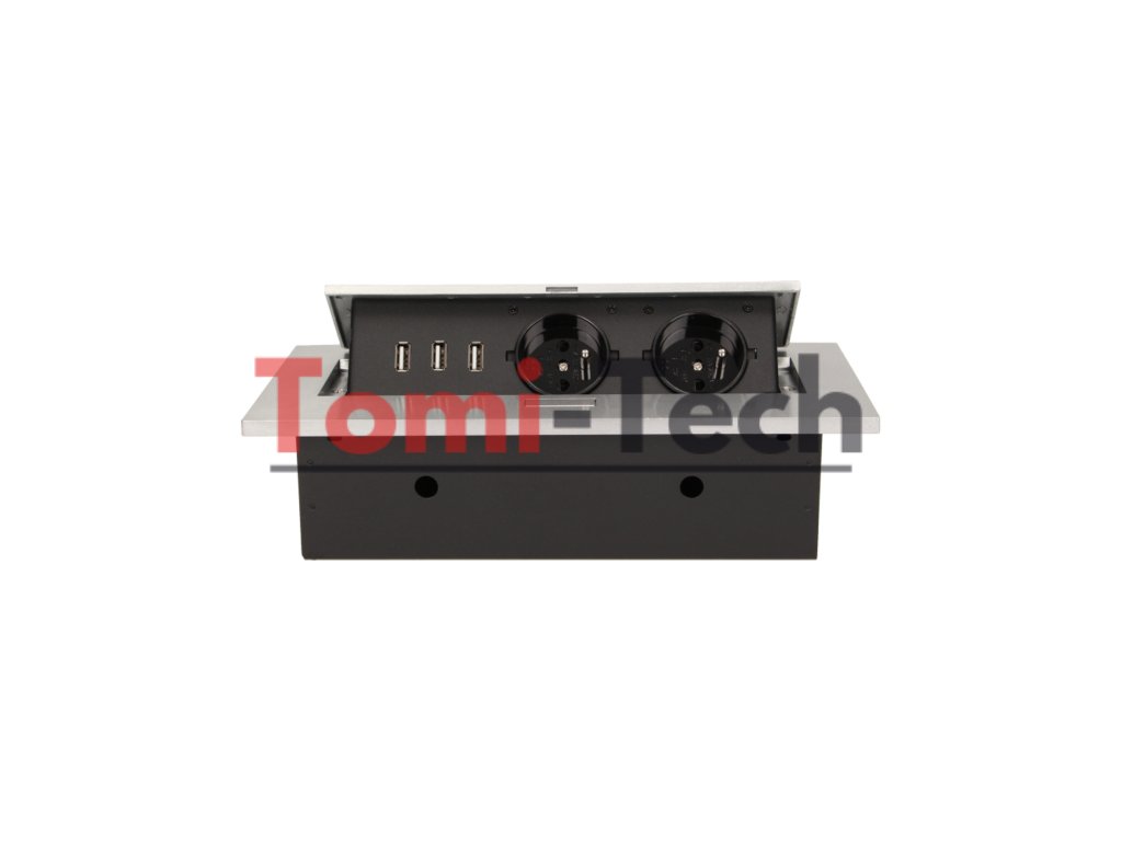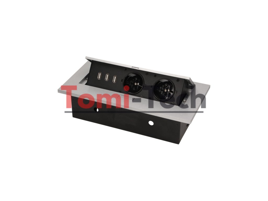 Sada dvoch uzemnených zásuviek s krytkami napájacieho zdroja a tromi USB portami (napájací zdroj nie je súčasťou balenia) vo výsuvnom puzdre. Zariadenie je určené na montáž na stoly, kuchynské dosky a stoly a je možné ho namontovať vertikálne aj horizontálne, čím sa zabezpečí prístup k elektrickým zásuvkám. Odporúčaný kábel: 3 x 1,5 mm² (nie je súčasťou balenia). Dostupné farby: čierna, strieborná.Dodatočné parametre