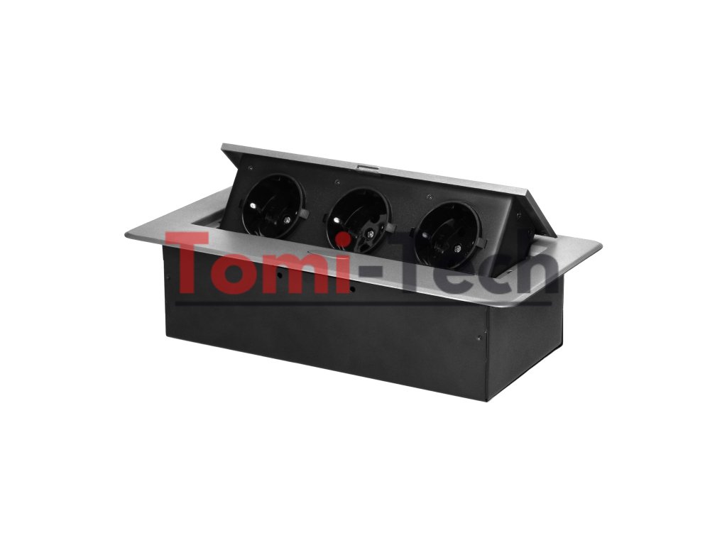 Nábytková zásuvka zapustená do pracovnej dosky s plochým frézovaným okrajom, 3x2P+Z (Schuko), strieborná
