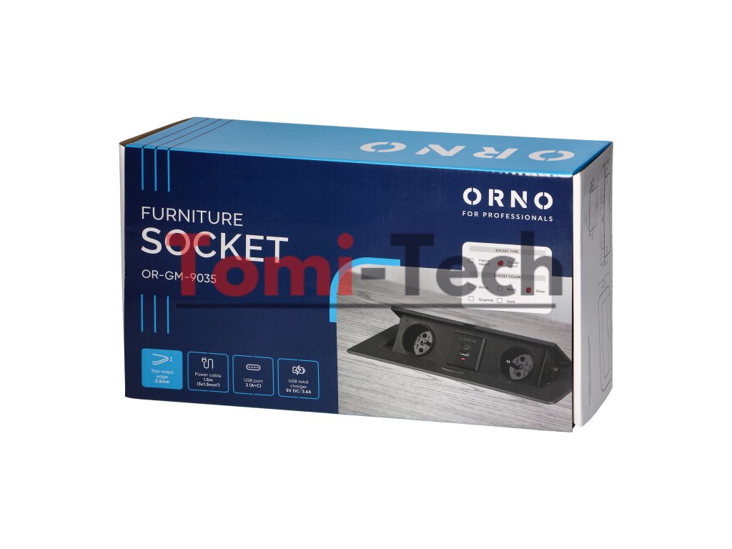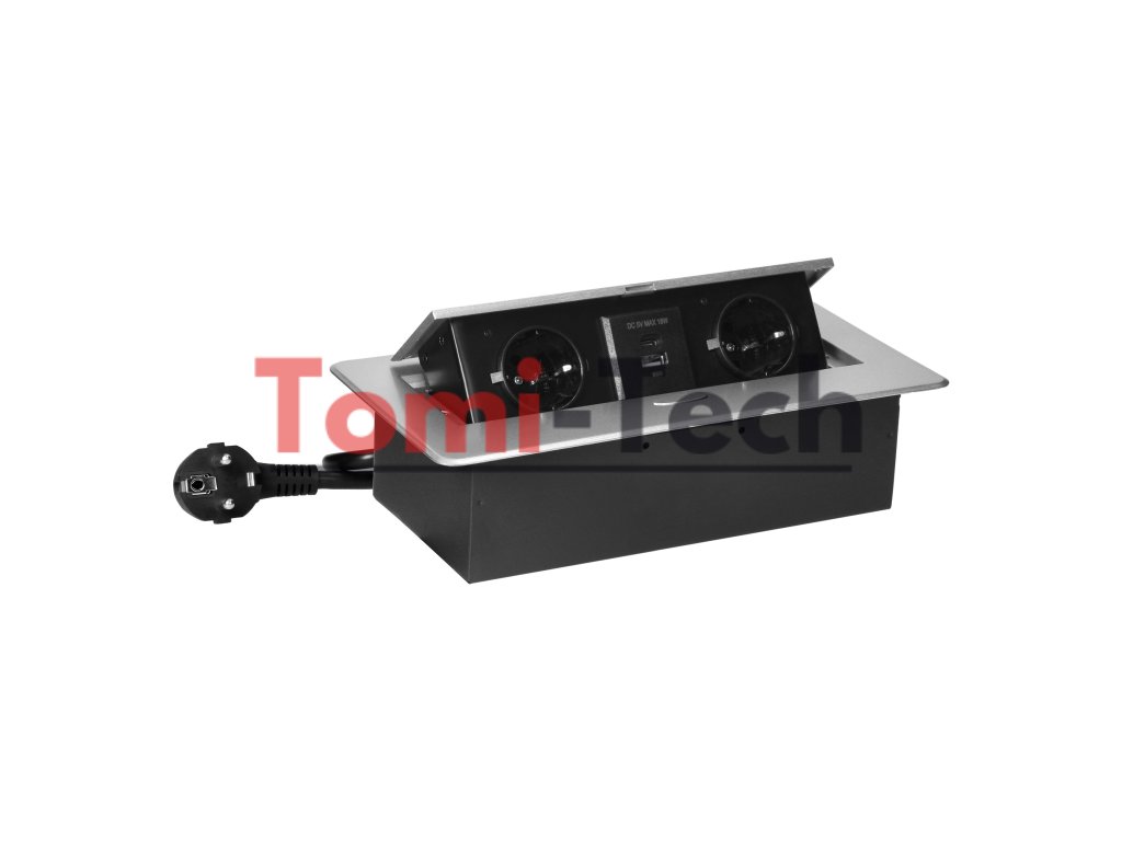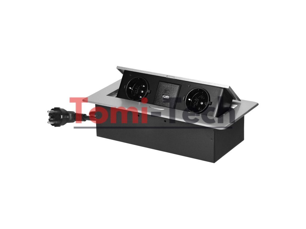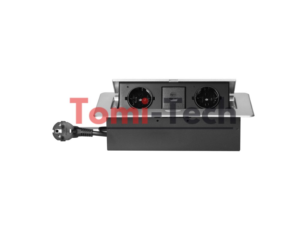 Nábytková zásuvka zapustená do kuchynskej linky s plochým frézovaným okrajom, USB nabíjačka a 1,5 m kábel, 2x2P+Z (Schuko), 2xUSB (typ A+C; 3,6A), striebornáDodatočné parametre