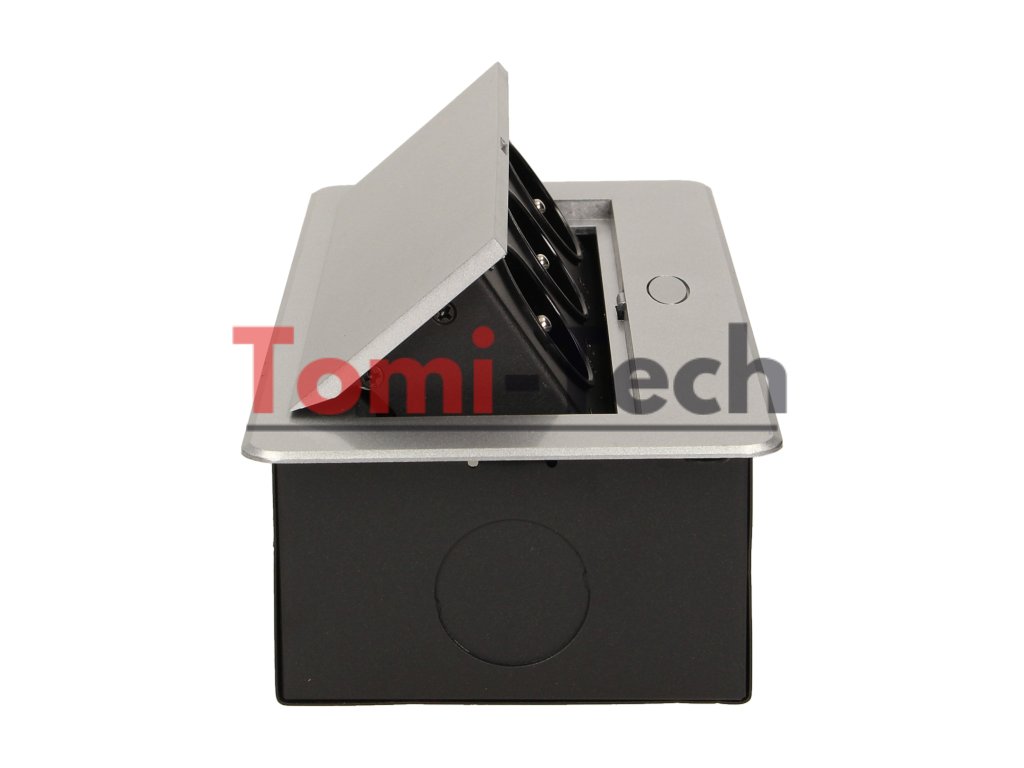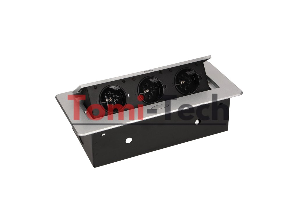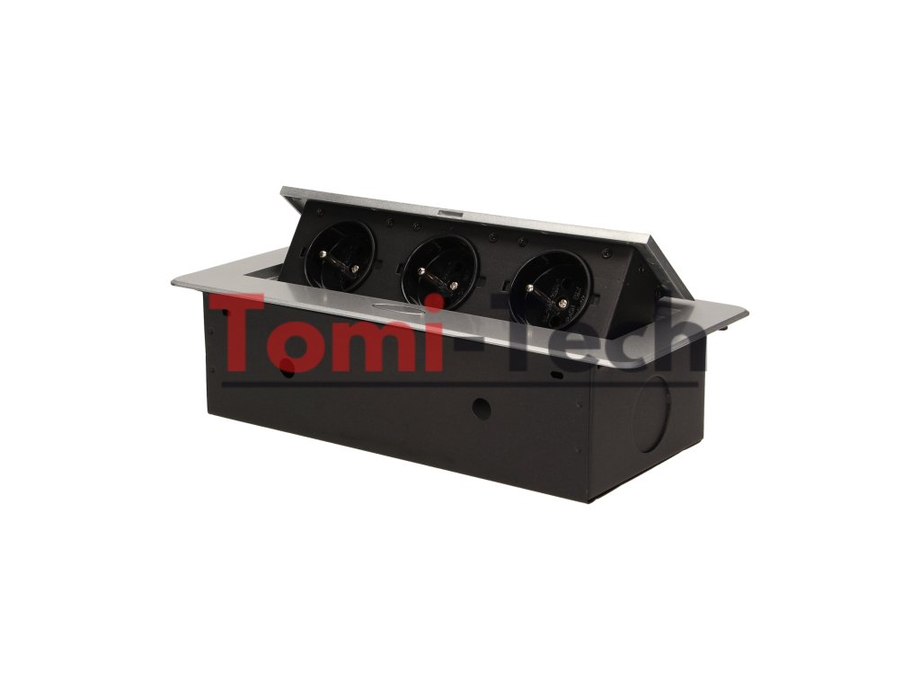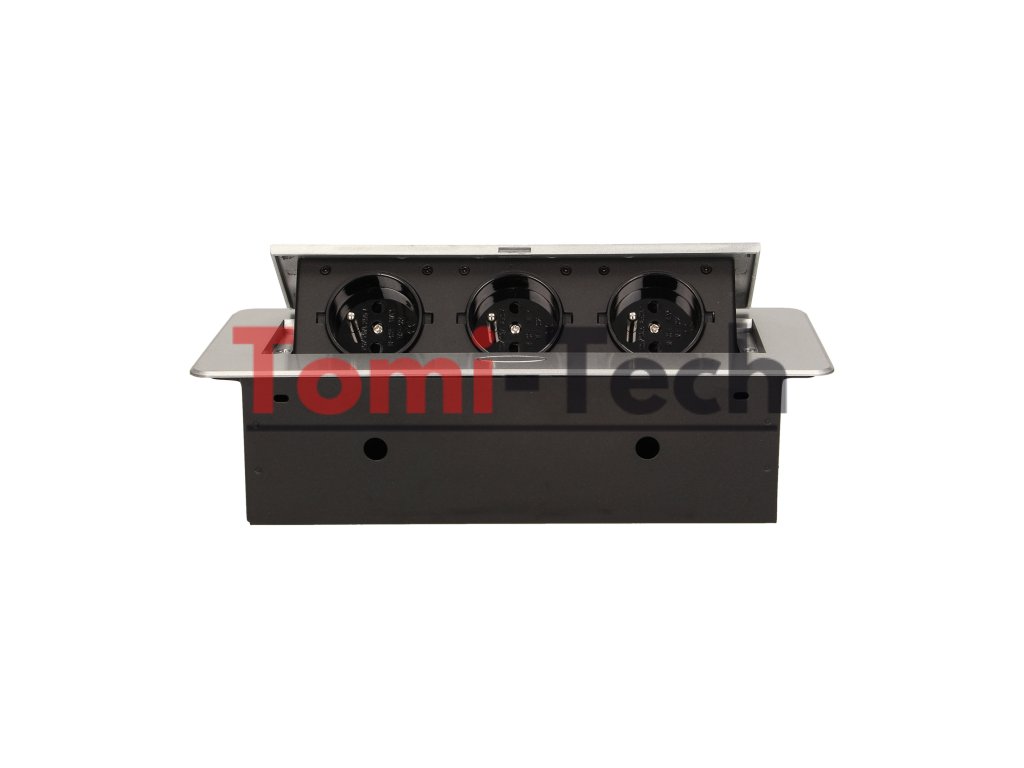 Sada troch uzemnených zásuviek s krytmi napájacieho zdroja vo výsuvnom stolovom puzdre. Zariadenie je určené na montáž na stoly, kuchynské dosky a stoly a je možné ho namontovať vertikálne aj horizontálne, čím sa zabezpečí prístup k elektrickým zásuvkám. Odporúčaný kábel: 3 x 1,5 mm² (nie je súčasťou balenia). Dostupné farby: čierna, strieborná, zlatá, mosadzná a grafitová.Dodatočné parametre
