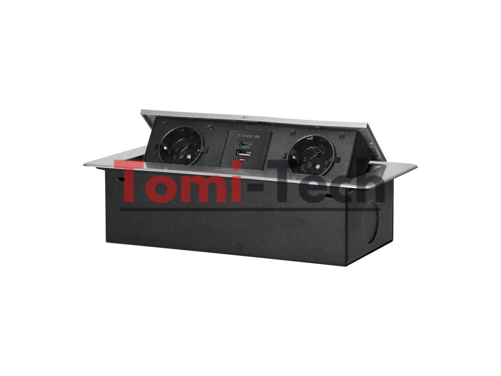 Nábytková zásuvka zapustená do kuchynskej linky s plochým frézovaným okrajom a USB nabíjačkou, 2x2P+Z (Schuko), 2x USB (typ A+C; 3,6A), striebornáDodatočné parametre