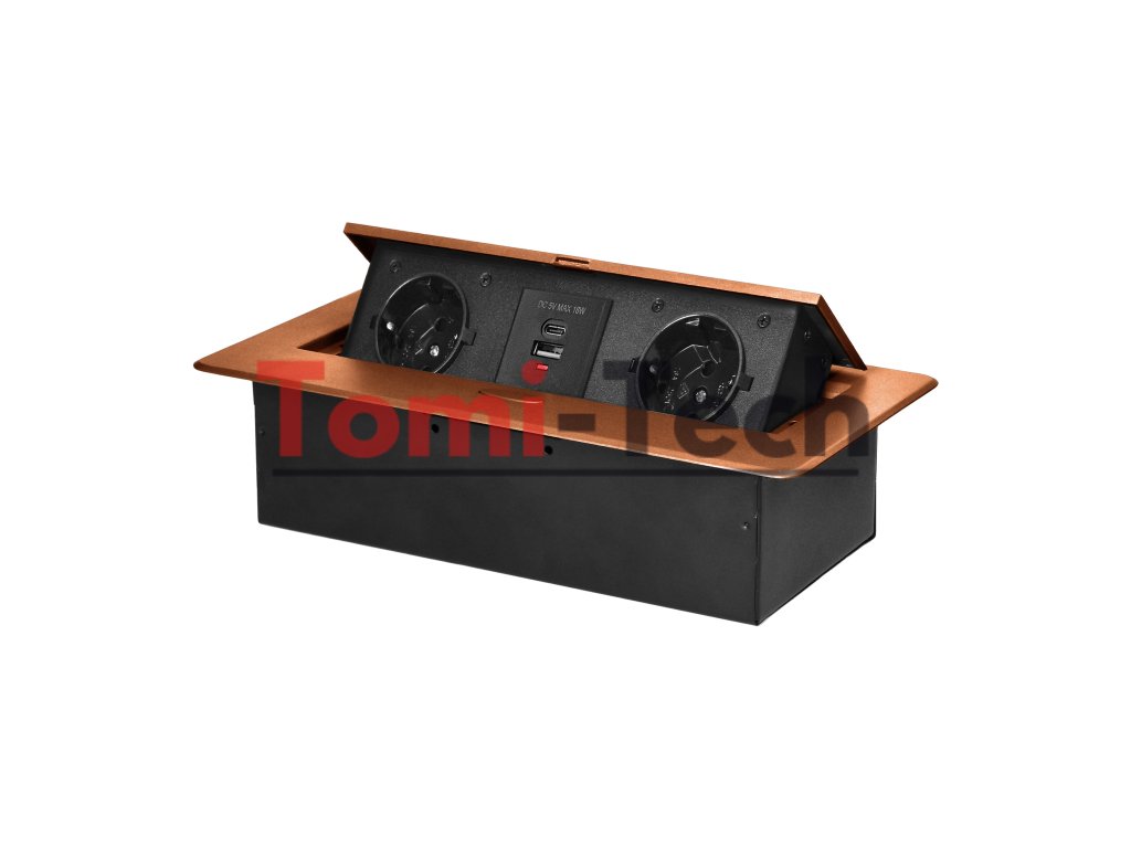 Nábytková zásuvka zapustená do kuchynskej linky s plochým frézovaným okrajom a USB nabíjačkou, 2x2P+Z (Schuko), 2xUSB (typ A+C; 3,6A), zlatáDodatočné parametre