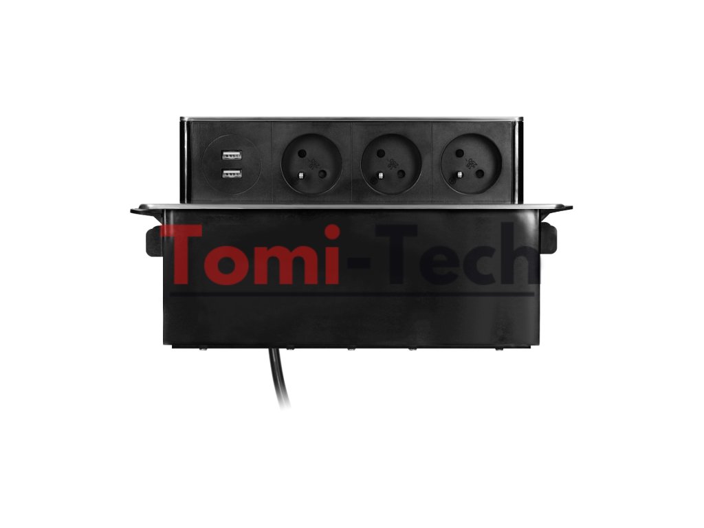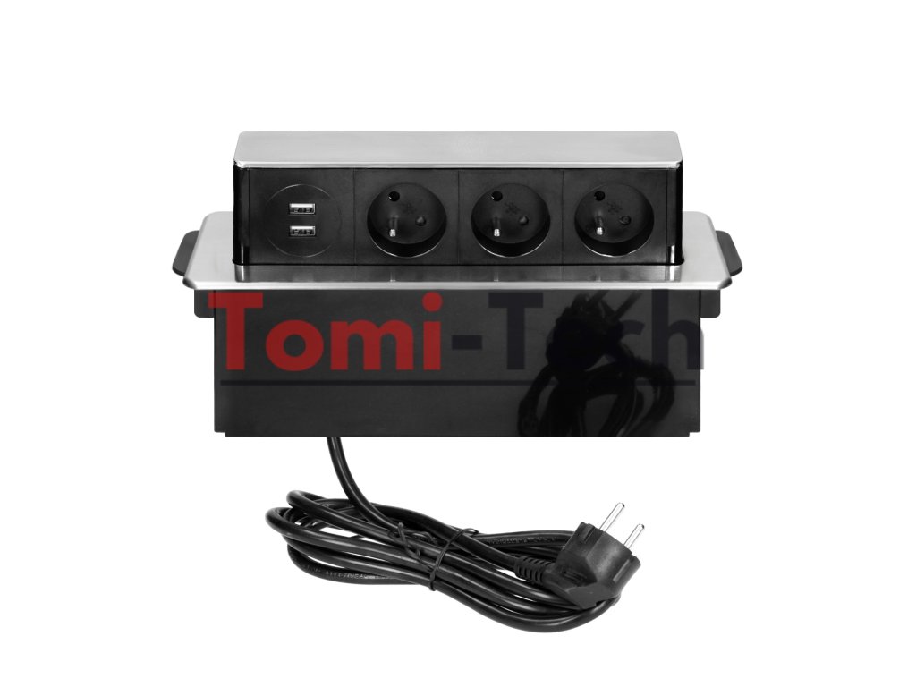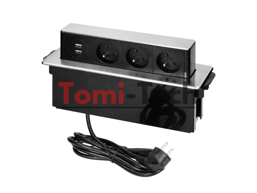 Elegantná skrinka s panelom z nehrdzavejúcej ocele, ktorá obsahuje sadu troch uzemnených zásuviek typu E a dva porty USB. Skrinka je vhodná na montáž na konferenčné stoly, kancelárske a kuchynské dosky, je skrytá v doske a vďaka plochému, frézovanému okraju je prakticky neviditeľná. Panel so zásuvkami sa vysúva na pripojenie externých zariadení. Dodáva sa s 2-metrovým káblom.Dodatočné parametre