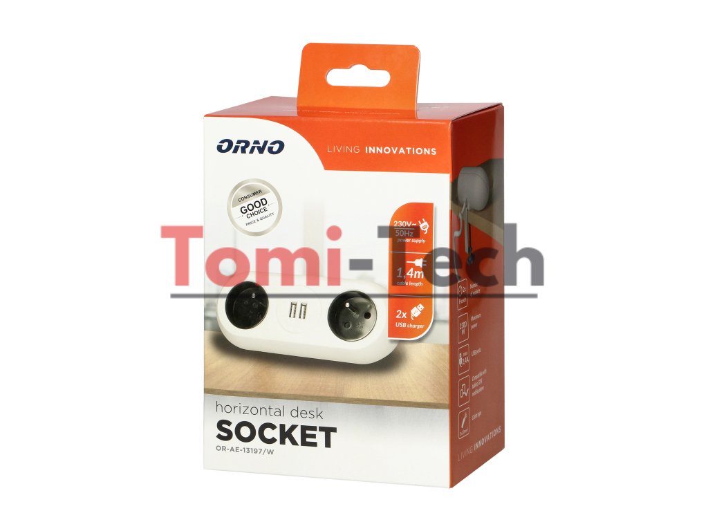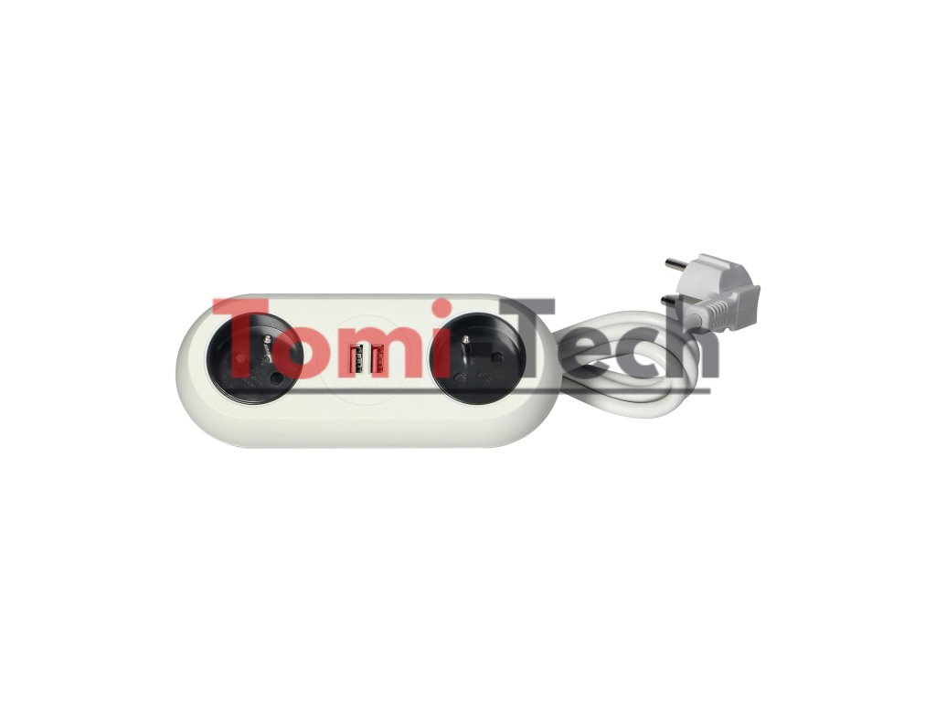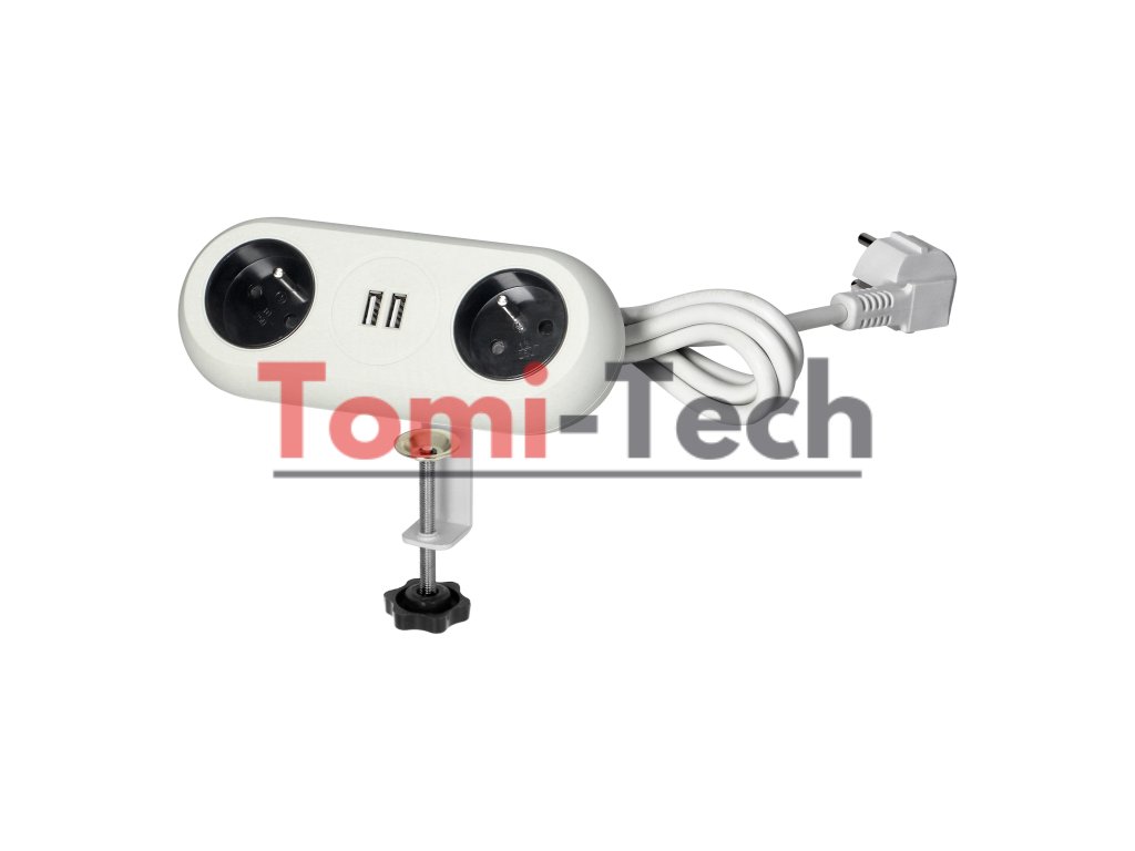 Nábytková zásuvka s montážnym držiakom a nabíjačkou pre všetky typy mobilných zariadení nabíjaných cez USB, ako sú tablety a smartfóny. Zariadenie obsahuje dve uzemnené sieťové zásuvky s ochranou proti prúdu, dva USB nabíjacie porty, 1,4 m flexibilný kábel a skrutkovú svorku, ktorá umožňuje pripevniť základňu zásuvky k okraju stola alebo police bez nutnosti vŕtania montážnych otvorov.Dodatočné parametre