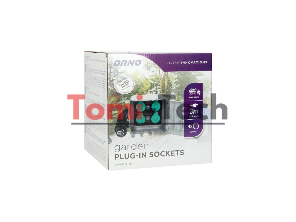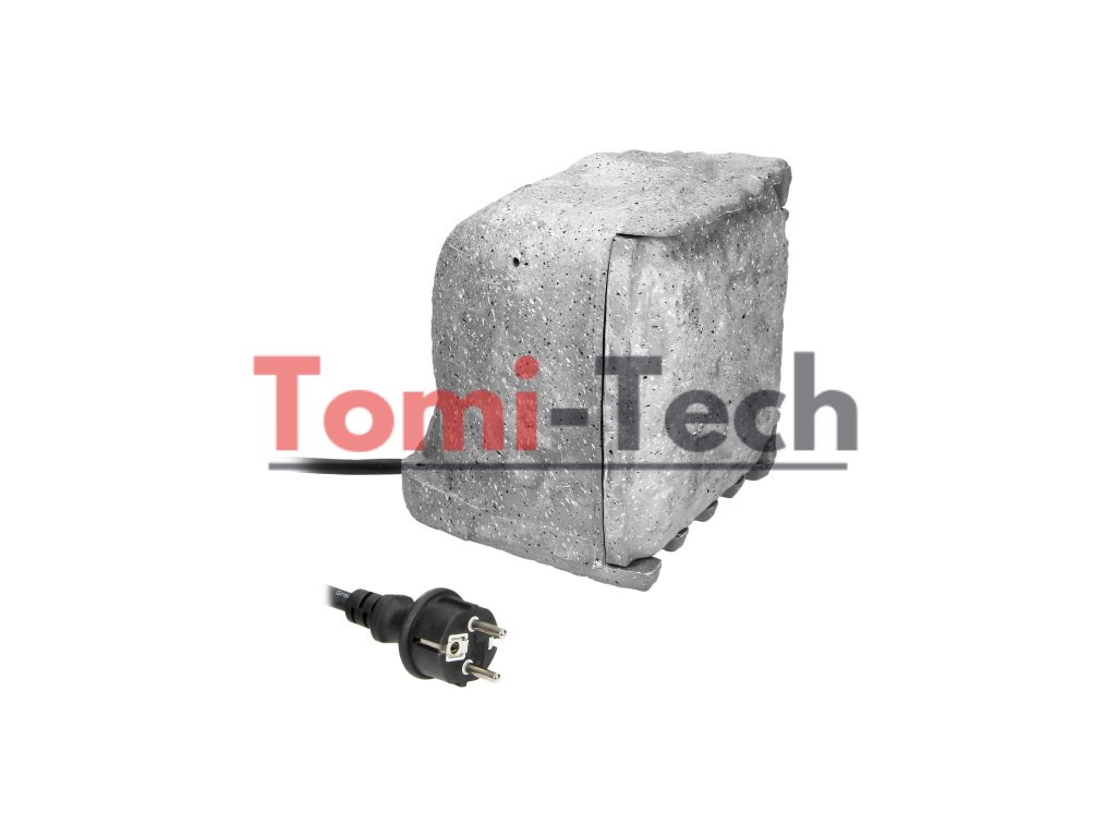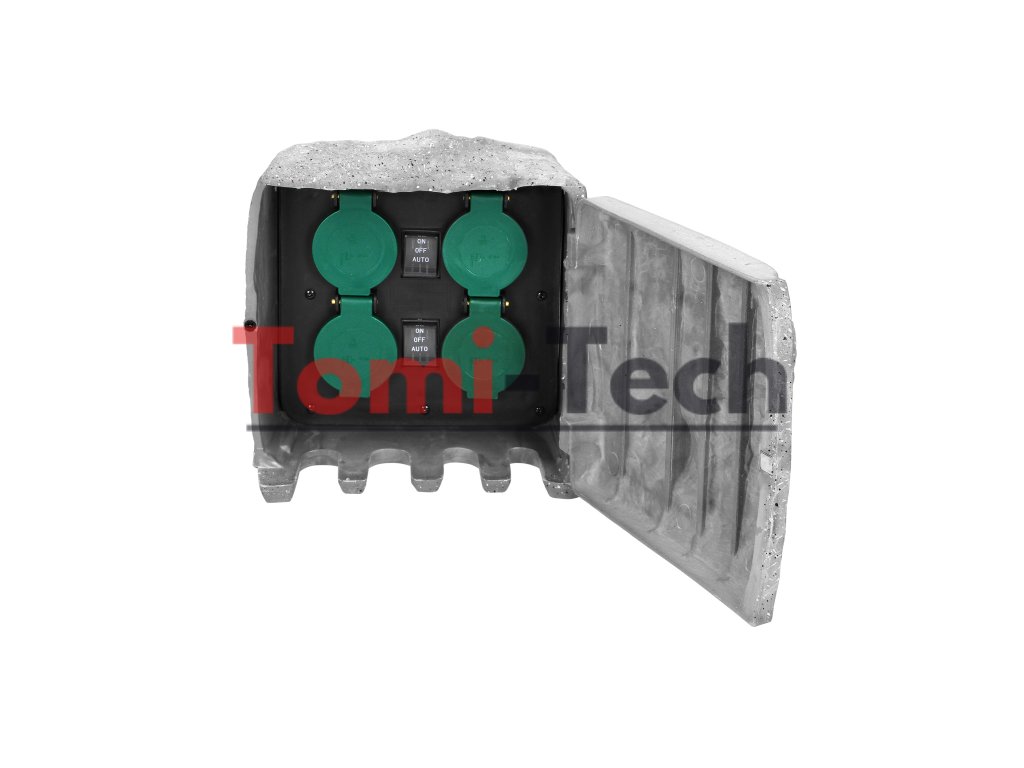 Záhradné zásuvky Schuko (4x2P+Z) v plastovom puzdre s efektom kameňa. Tento dizajn chráni zásuvky pred poveternostnými vplyvmi a umožňuje im ľahko splynúť so záhradným prostredím. Sú vybavené 3 m gumeným káblom a dvoma prevádzkovými režimami: manuálny (max. 3680 W) alebo ovládanie senzorom súmraku (max. 1100 W).Dodatočné parametre