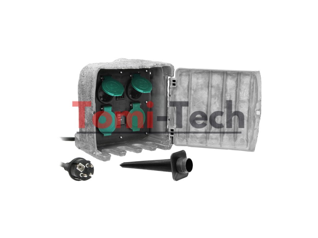 Záhradná zásuvka KAMIEŃ, 4x2P+Z (schuko), gumený kábel H07RN-F 3x1,5 mm², 3 m, 2 prevádzkové režimy: automatický (max. 1100 W)/manuálny (max. 3680 W)