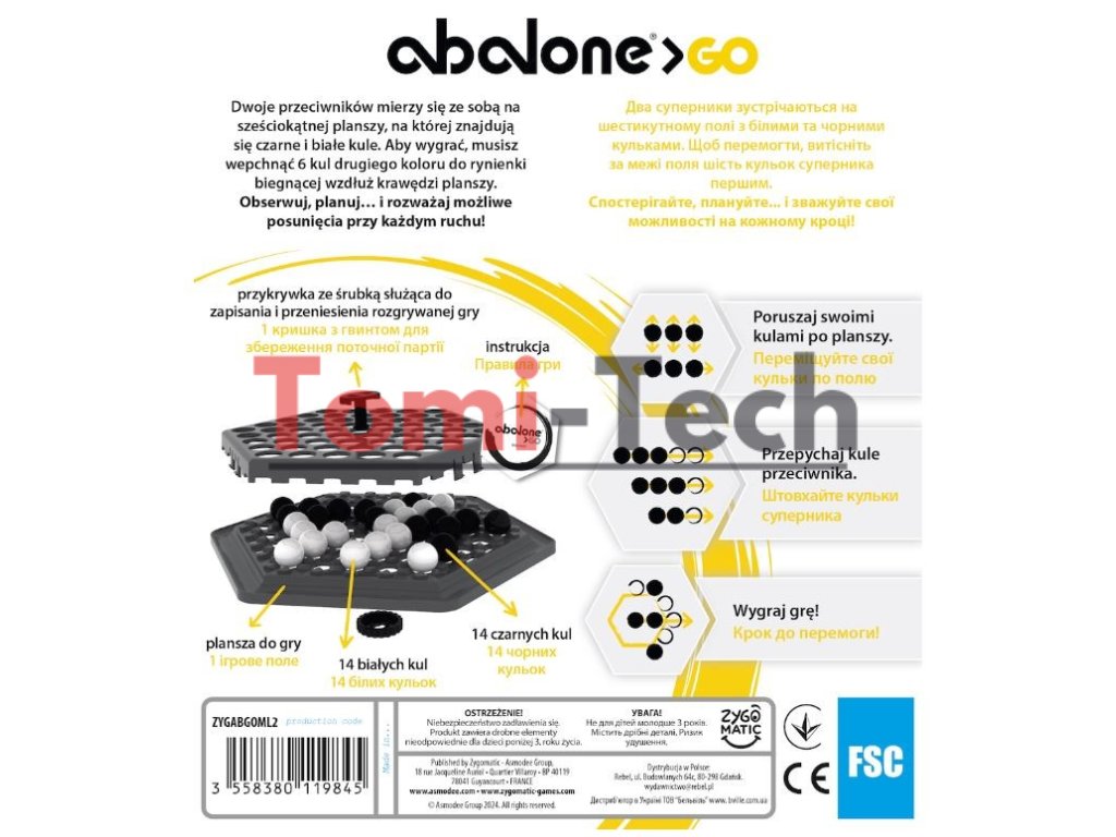- Praktické balenie umožňuje bezproblémovú prepravu hry aj jej uloženie v prípade, že ju budeme musieť náhle prerušiť. Vďaka tomu je Abalone GO skvelým spoločníkom na cesty, ktorý nám spríjemňuje čas strávený na cestách aj doma.