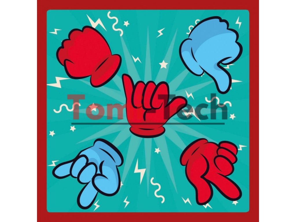 - Koordinácia - Karta obsahuje kresby rúk v 2 farbách (modrá pre ľavú ruku a červená pre pravú). Zakryte kartu rukou, ktorá zodpovedá farbe na obrázku. Tento obrázok zobrazuje 1 z 3 gest: kameň, papier alebo nožnice. Po zakrytí karty druhou rukou ukážte gesto, ktoré vám umožní prekonať gesto na karte.
