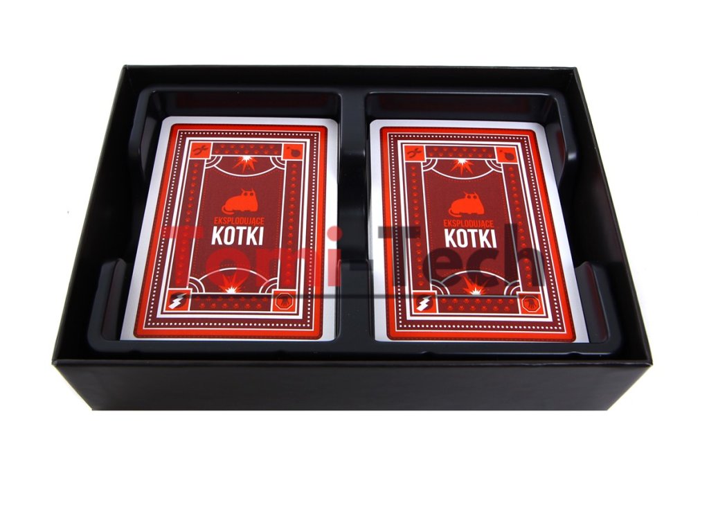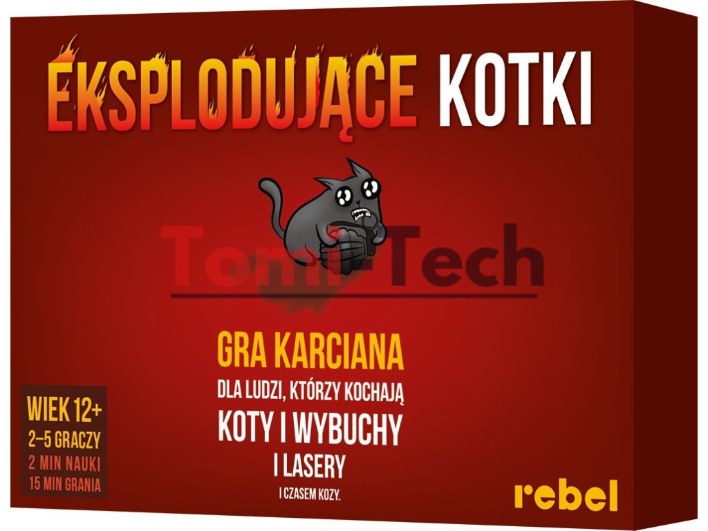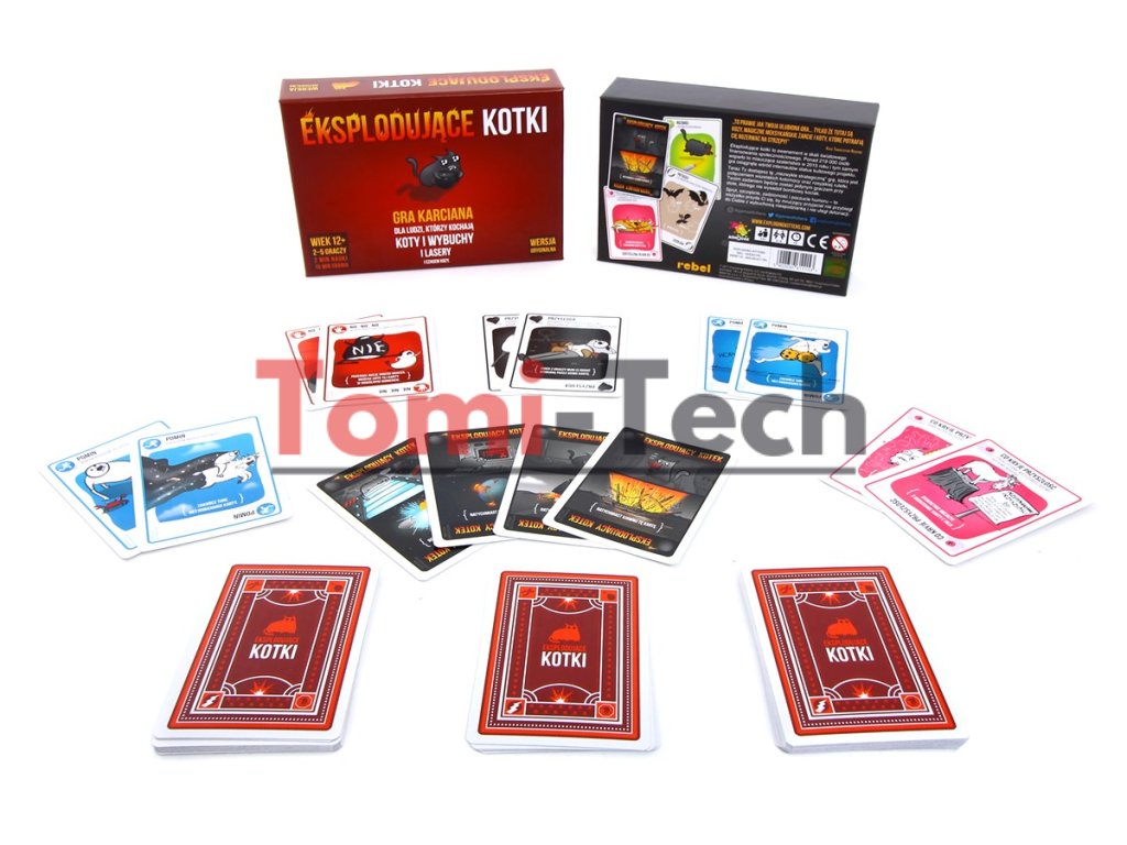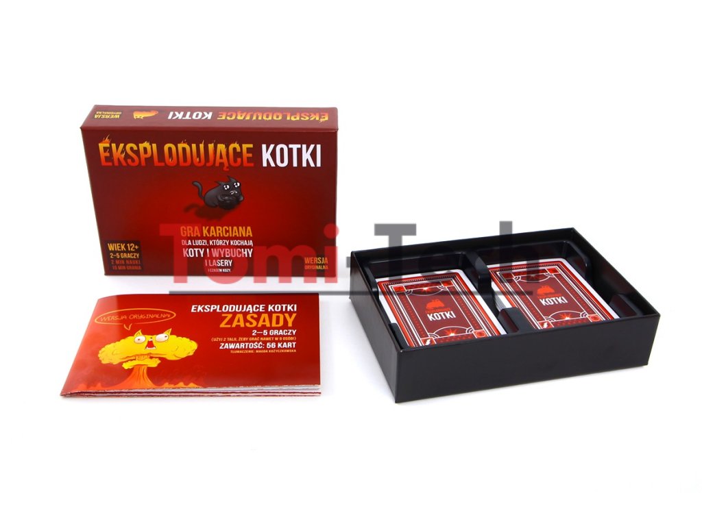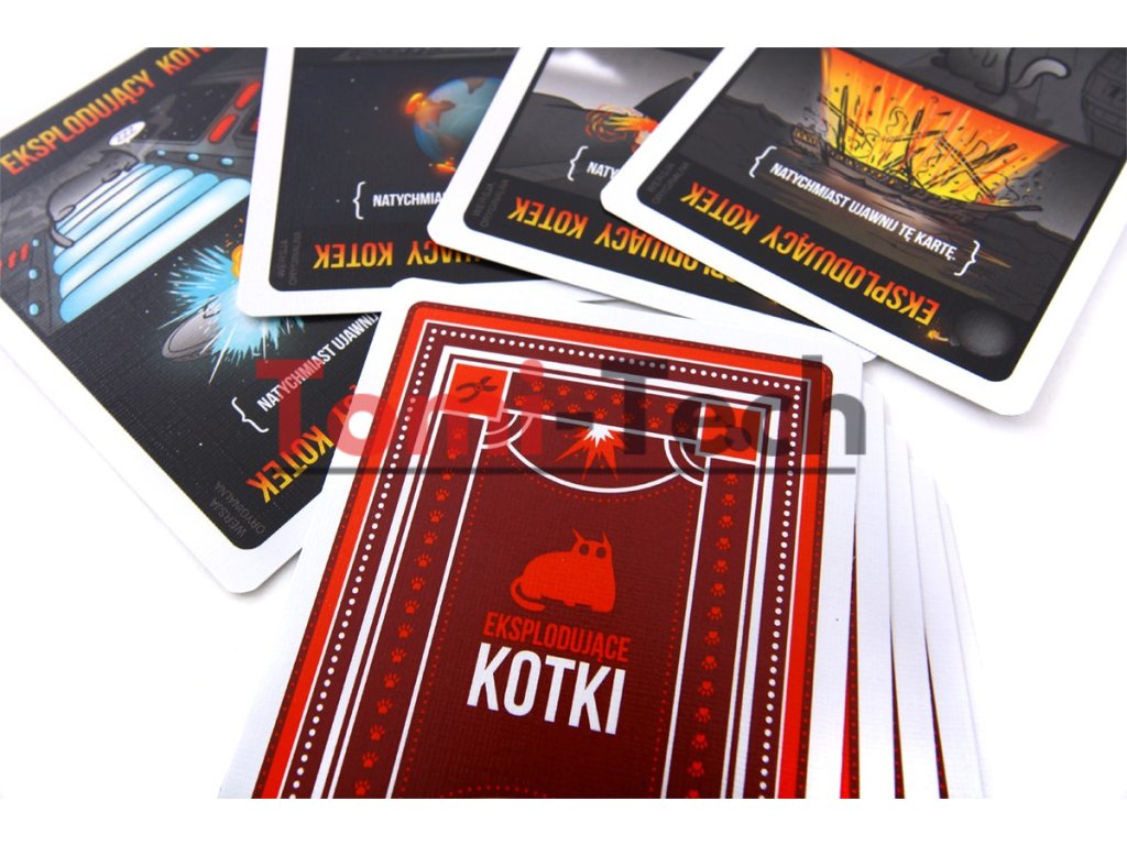 Exploding Cats je verzia ruskej rulety poháňaná mačiatkami. Hráči si v každom kole ťahajú kartu, kým si nevytiahnu explodujúcu mačku – potom nešťastné stvorenie exploduje a zomrie a hra končí. Ale! Balíček obsahuje aj karty, ktoré možno použiť na odvrátenie pozornosti samovražedného mačiatka, na vyhýbanie sa mu alebo na prinútenie súpera ťahať niekoľko kariet naraz.