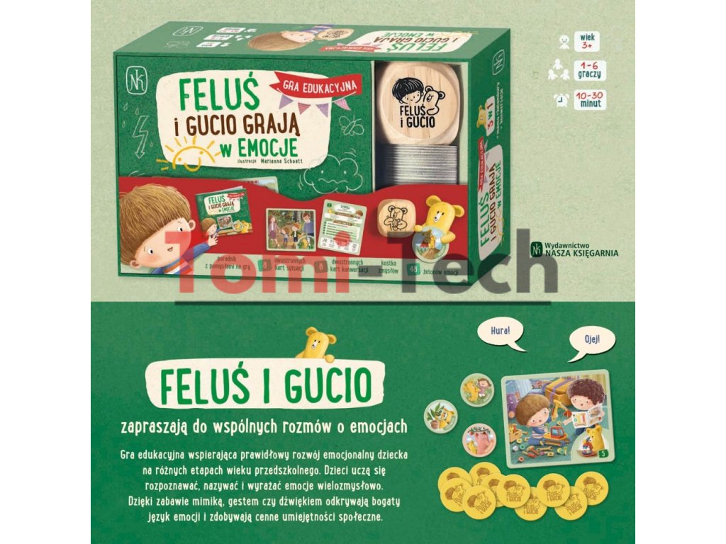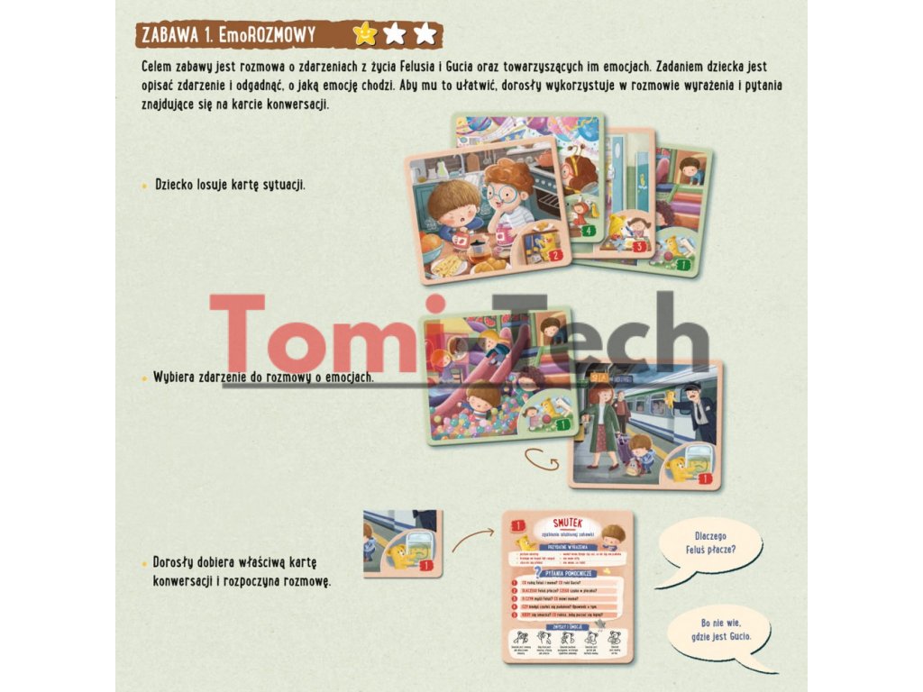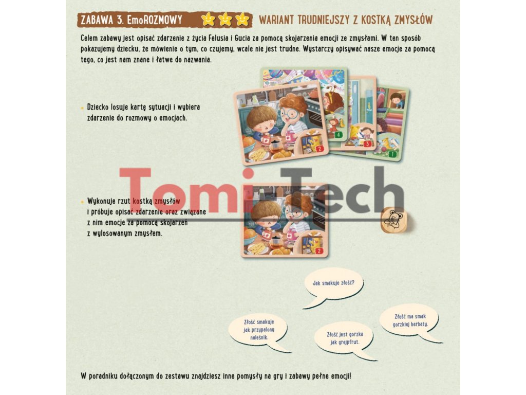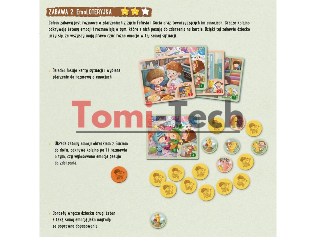 Ďalšia hra v sérii, ale prvá s takou rozmanitou sadou hier a aktivít! Ideálna ako samostatný vzdelávací balíček a doplnok ku knihe „Feluś a Gucio sa učia o emóciách“. Hra podporuje zdravý emocionálny vývoj a pomáha rodičom v náročných rozhovoroch s ich deťmi o emóciách.