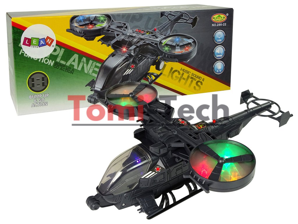 Vojenský vrtuľník s obrovskými krídlami, svetelným zvukom a rotáciou