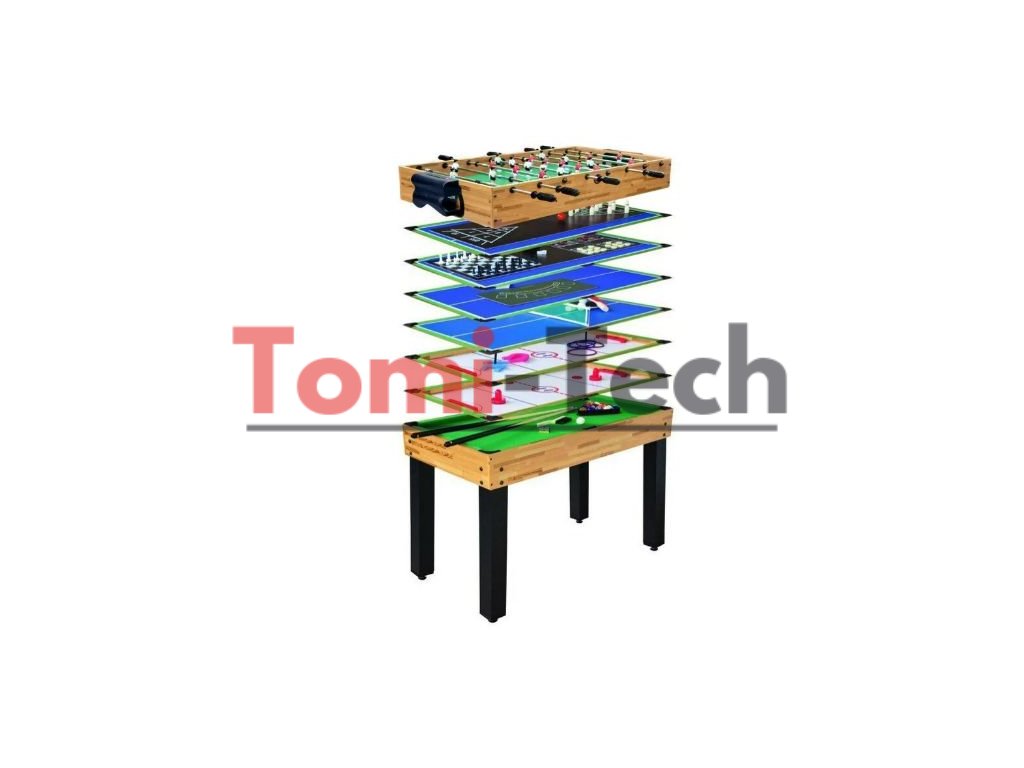 Veľa zábavy s hracím stolom vďaka praktickému multifunkčnému prevedeniu. Tento veľký multifunkčný hrací stôl zložený z 12 hier je vhodný pre rodinu a aj hry s priateľmi.Hracie pole spolu s príslušenstvom (tága, gule, odrážače, puk, karty, kocky, figúrky a mnoho ďalšieho),sú umiestnené prakticky pod hracou doskou stolného futbalu,takže ich máte vždy po ruke.