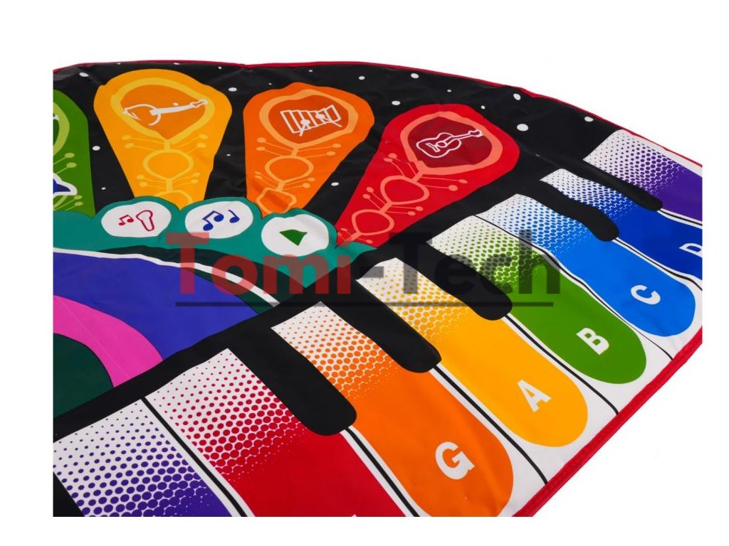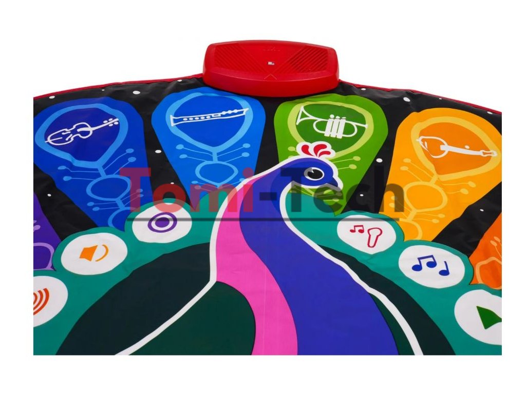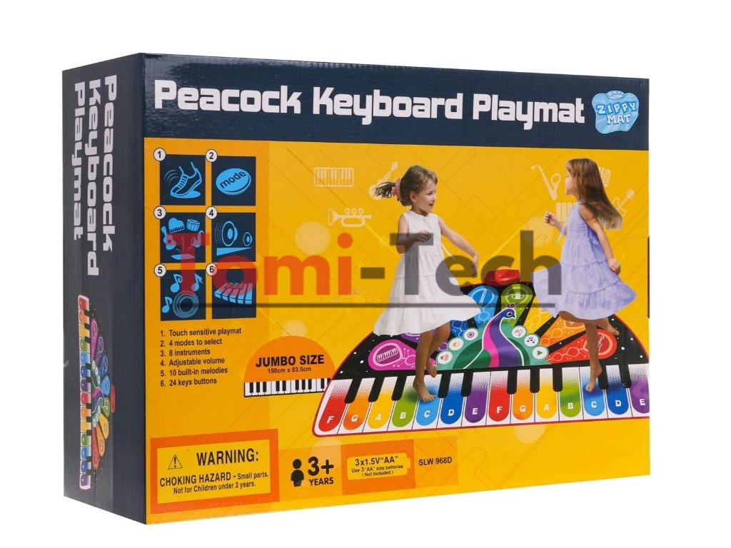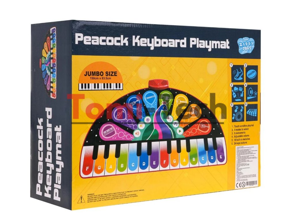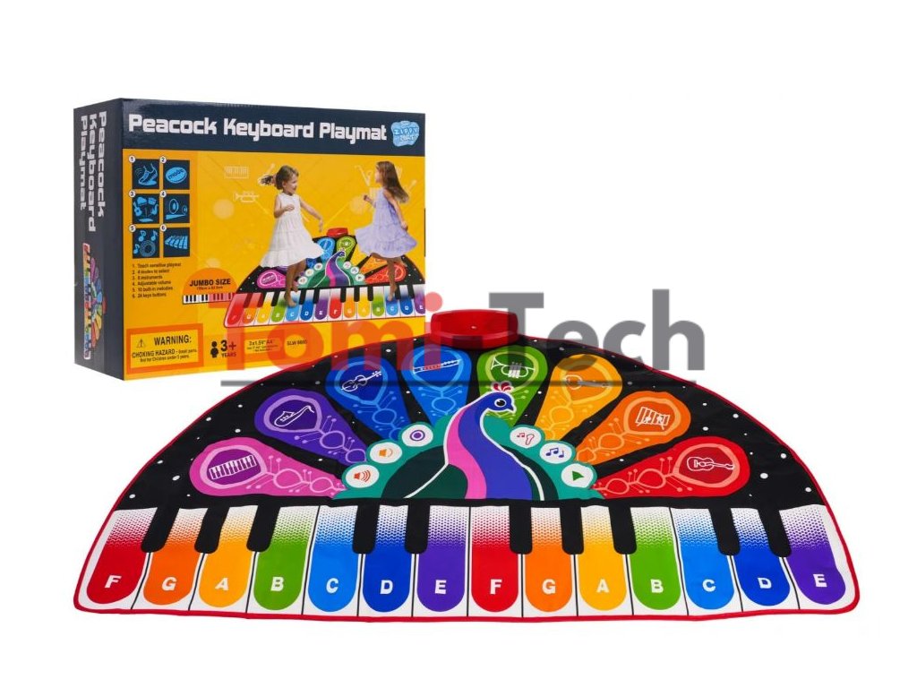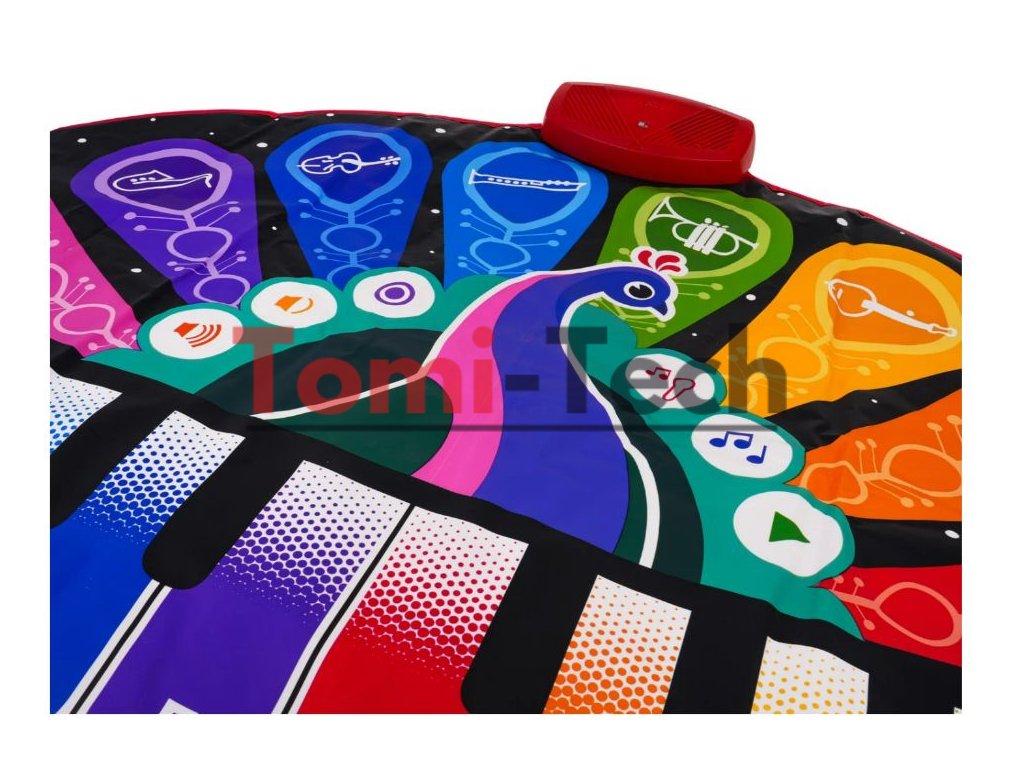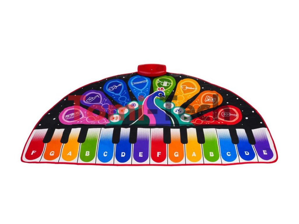 Veľká hudobná podložka v tvare keyboardu pre deti od 3 rokov , ktoré majú rady pohyb, hudbu a skvelú zábavu. Podložka rozvíja hudobné zručnosti, koordináciu a zmyslové schopnosti prostredníctvom hry. V spodnej časti podložky sa nachádza dotykový keyboard s 24 farebnými klávesmi. Na farebnom pávovi je na každom z ôsmich pierok tlačidlo s iným hudobným nástrojom: klavír, vibrafón, hoboj, trúbka, saxofón, banjo, husle a gitara.Podložka má na výber zo 4 režimov: nahrávanie, prehrávanie záznamu, demo verzia, prehrávanie 10 vstavaných melódií. Môžeme tiež nastaviť jej hlasitosť. Na samotnej hornej strane podložky sa nachádza reproduktor. Podložka je napájaná 3 x AA 1,5 V batériami (nie sú súčasťou balenia). Podložka má protišmykovú úpravu a je vyrobená z bezpečných materiálov. Povrch podložky je mäkký a odolný, nečistoty a škvrny je možné ľahko zotrieť handričkou.